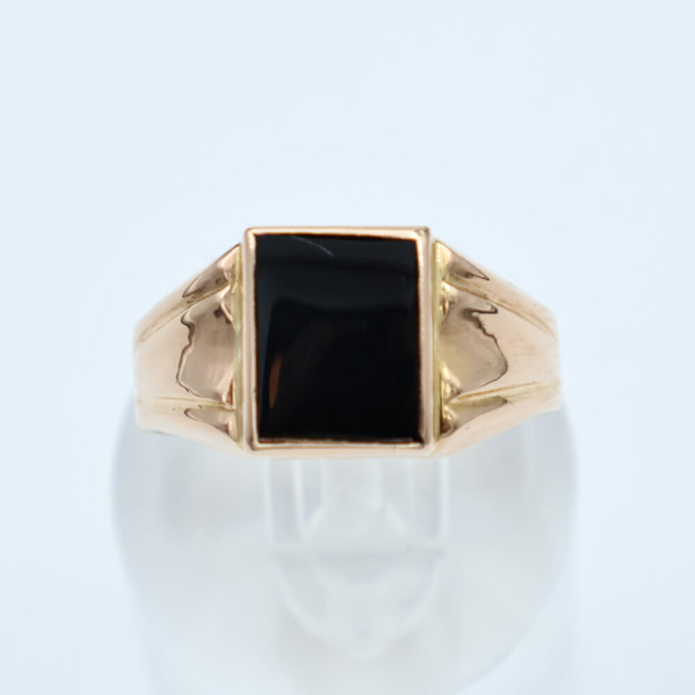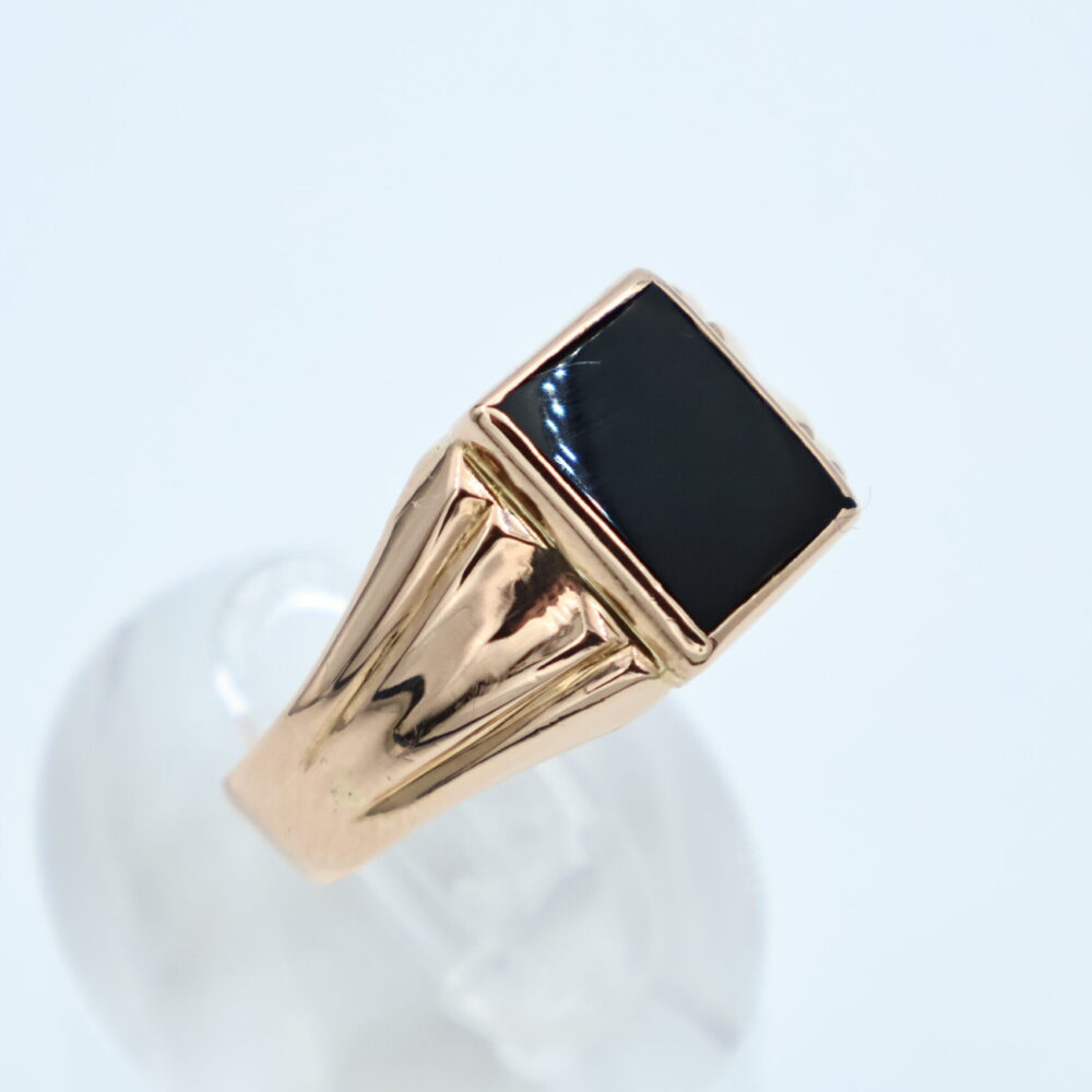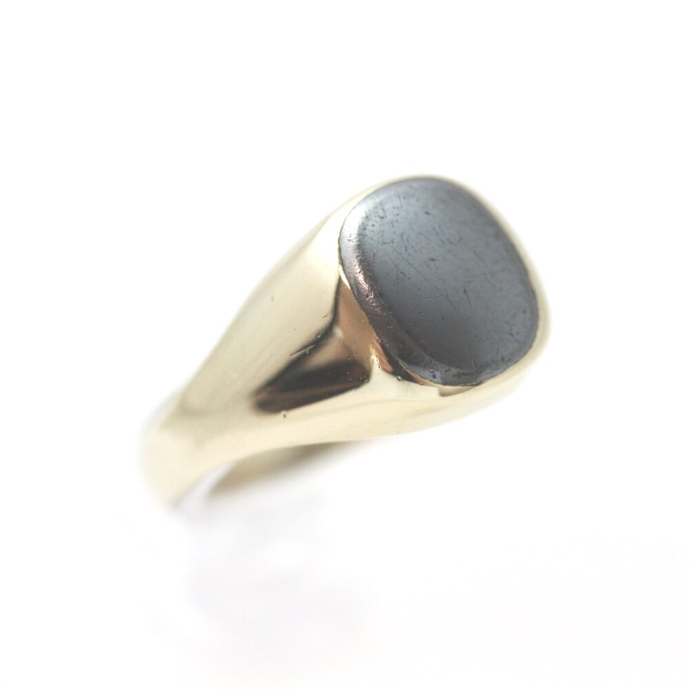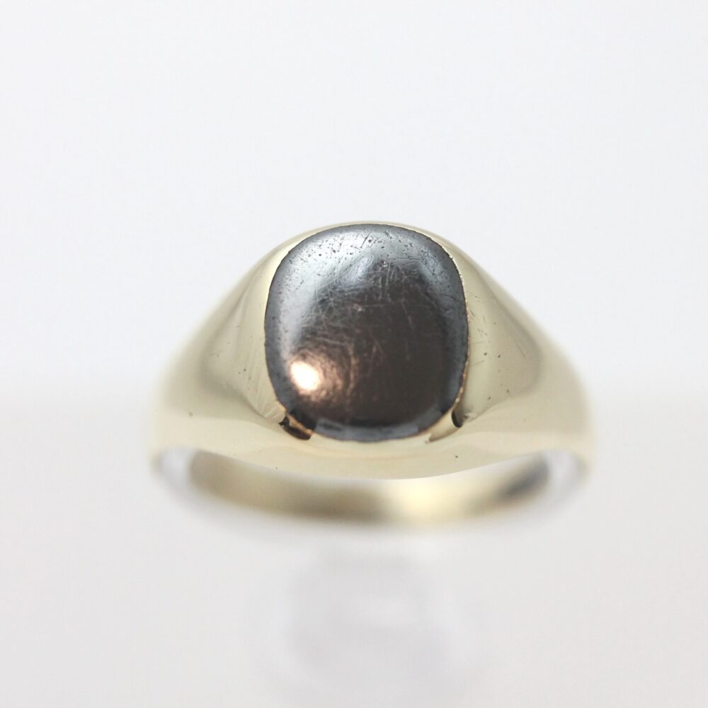 Ring i gult gull med hematitt 14kt gult gull største breddemål 12,12 mm totalvekt 4,41 gram dimensjoner sten 10,41×9,02 mm
