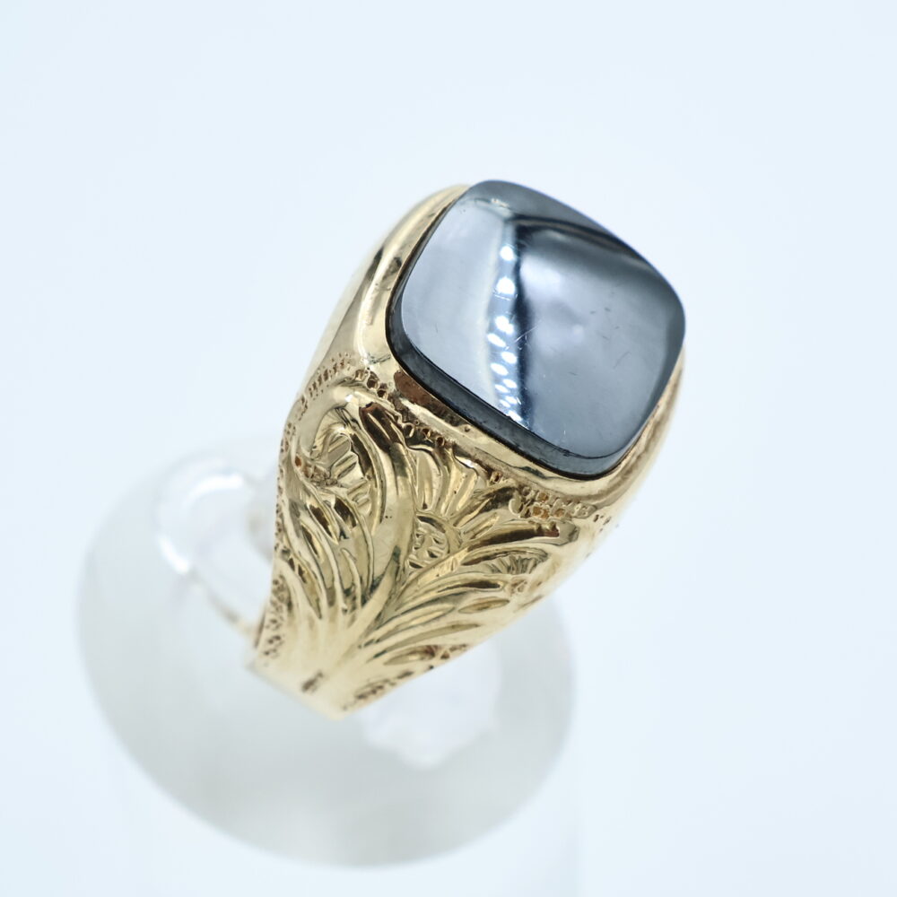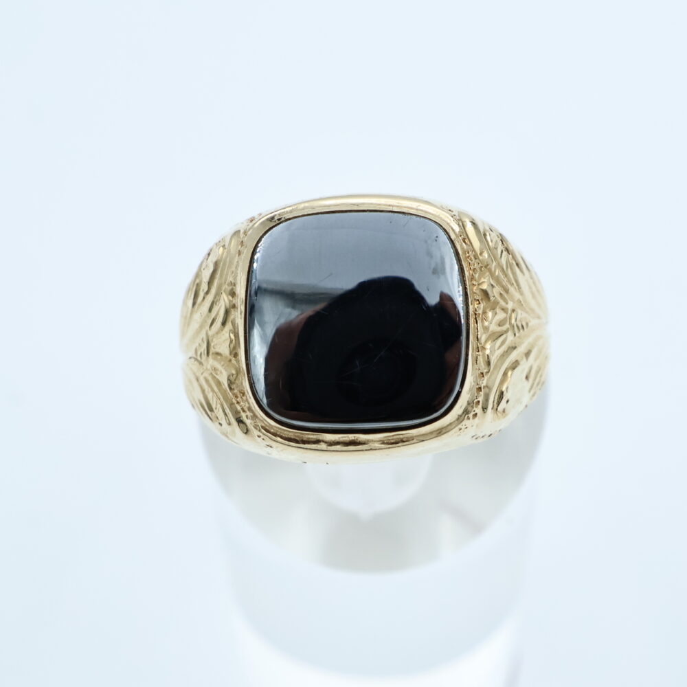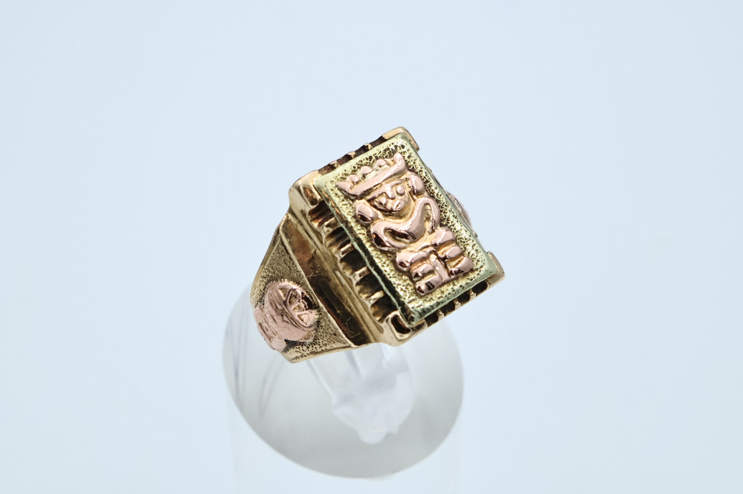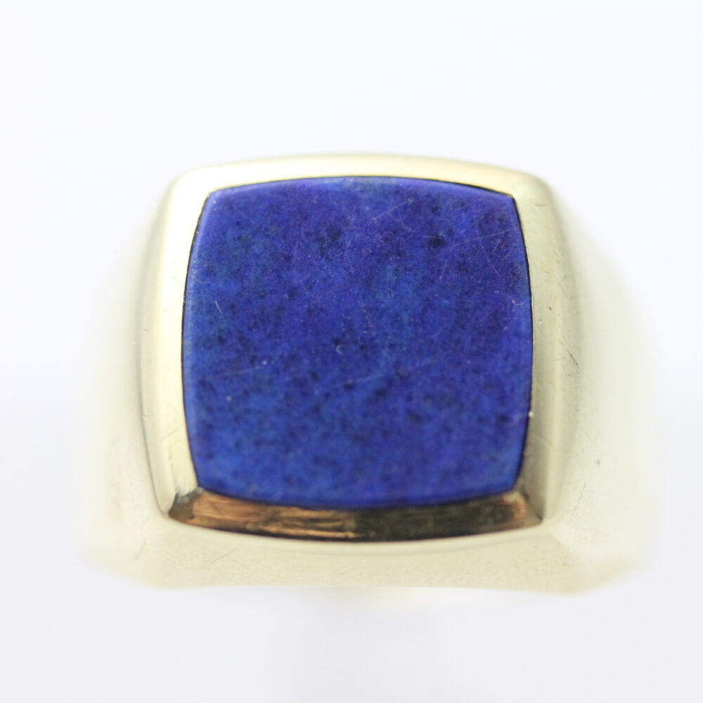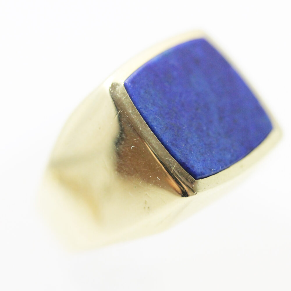 Ring i gult gull med blå lapis 14kt gult gull største breddemål 16,36 mm totalvekt 9,89 gram dimensjoner sten 13,28×13,24