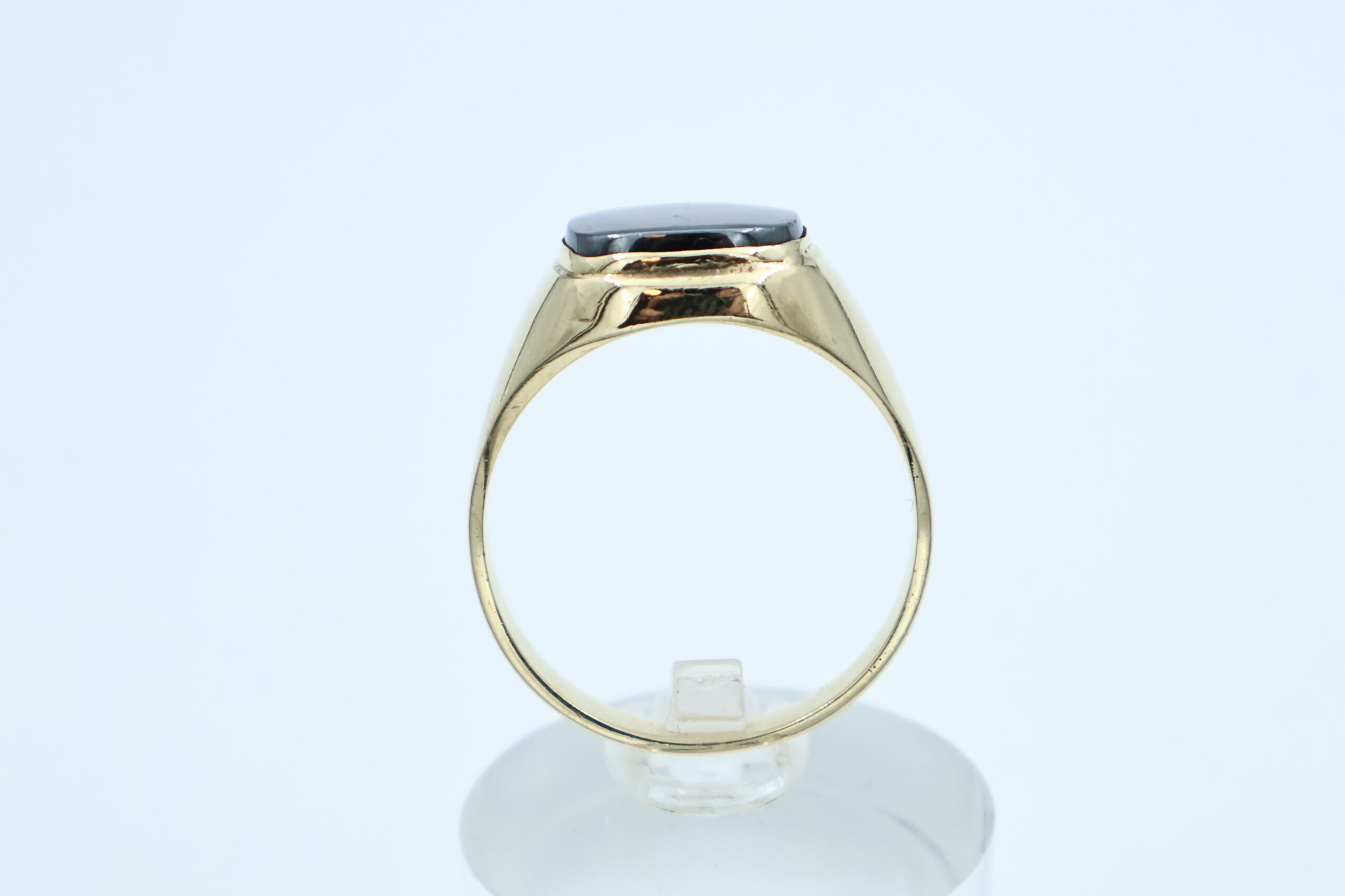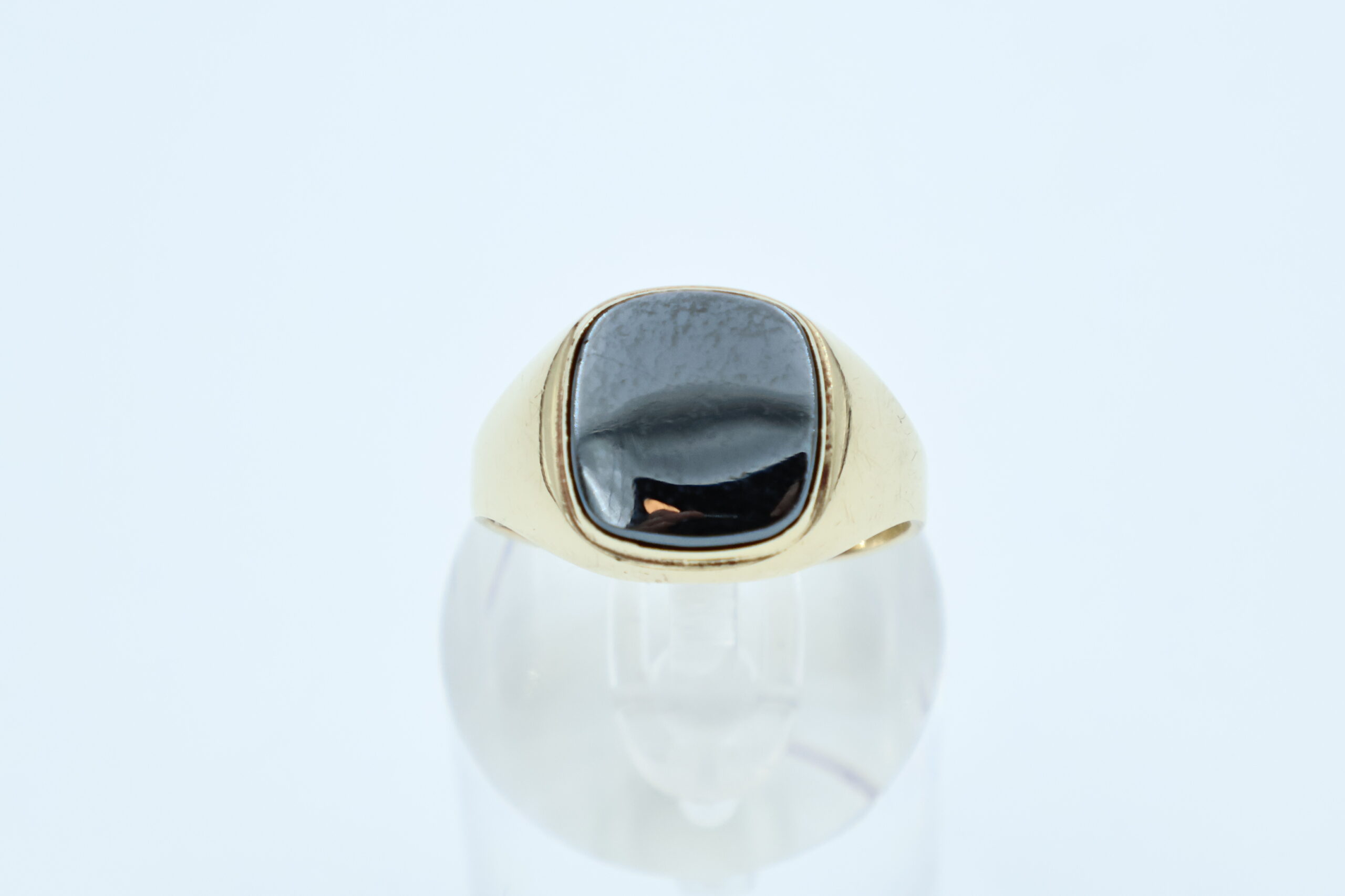 Ring i gult gull med hematitt 14kt gult gull største breddemål 15,08 mm totalvekt 4,05 gram dimensjoner sten 13,41×12,00 mm