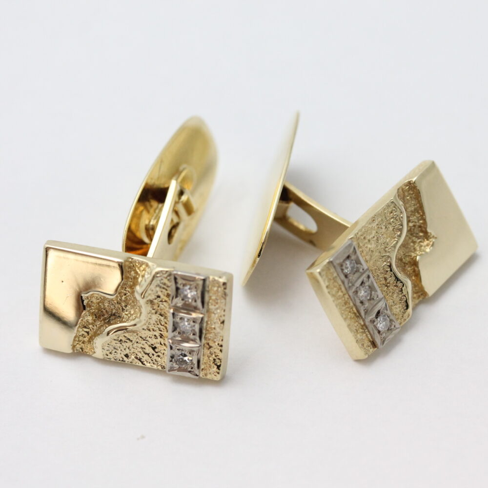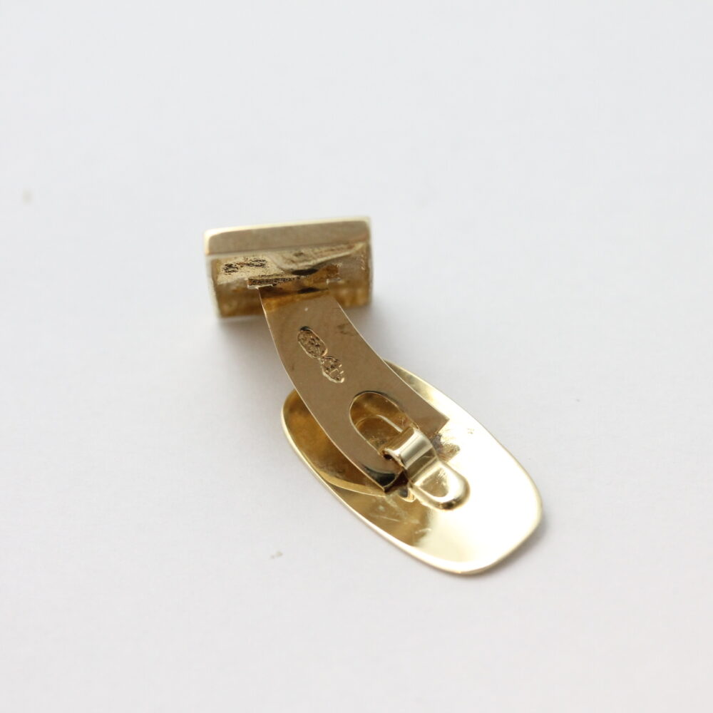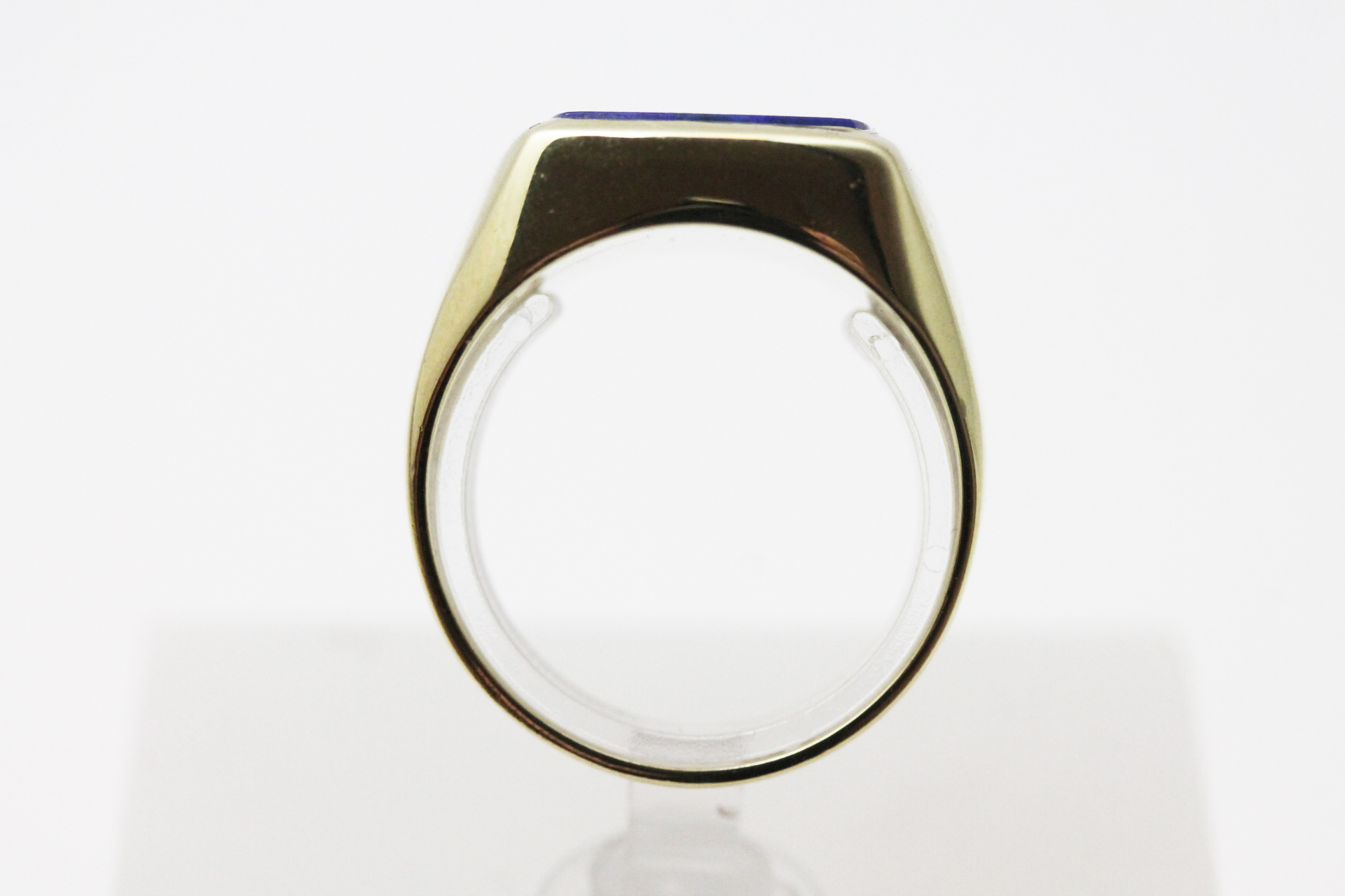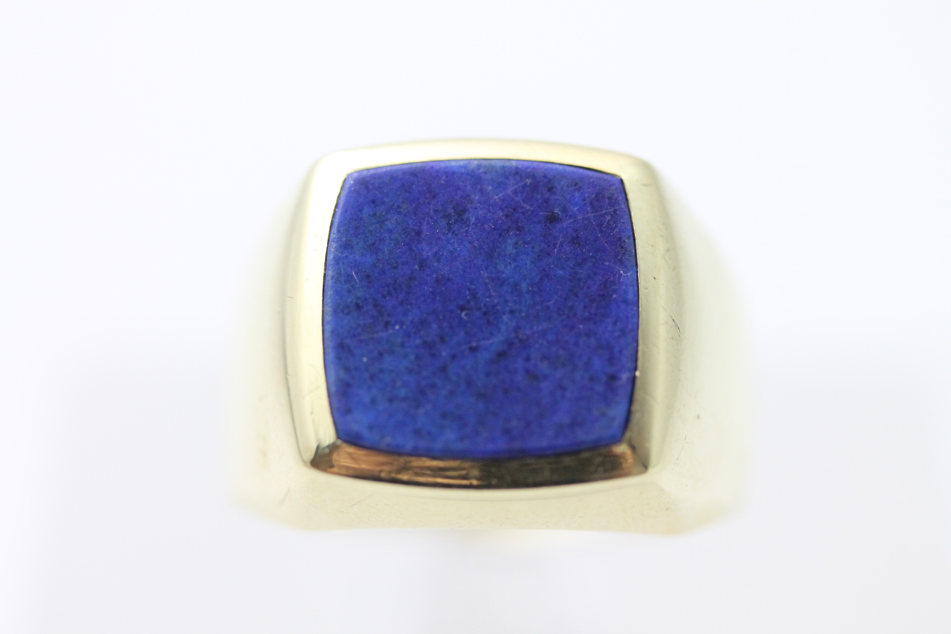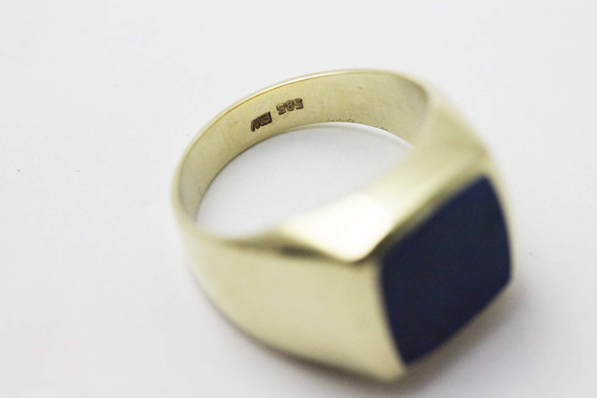 Ring i gult gull med hematitt 14kt gult gull største breddemål 12,12 mm totalvekt 4,41 gram dimensjoner sten 10,41×9,02 mm