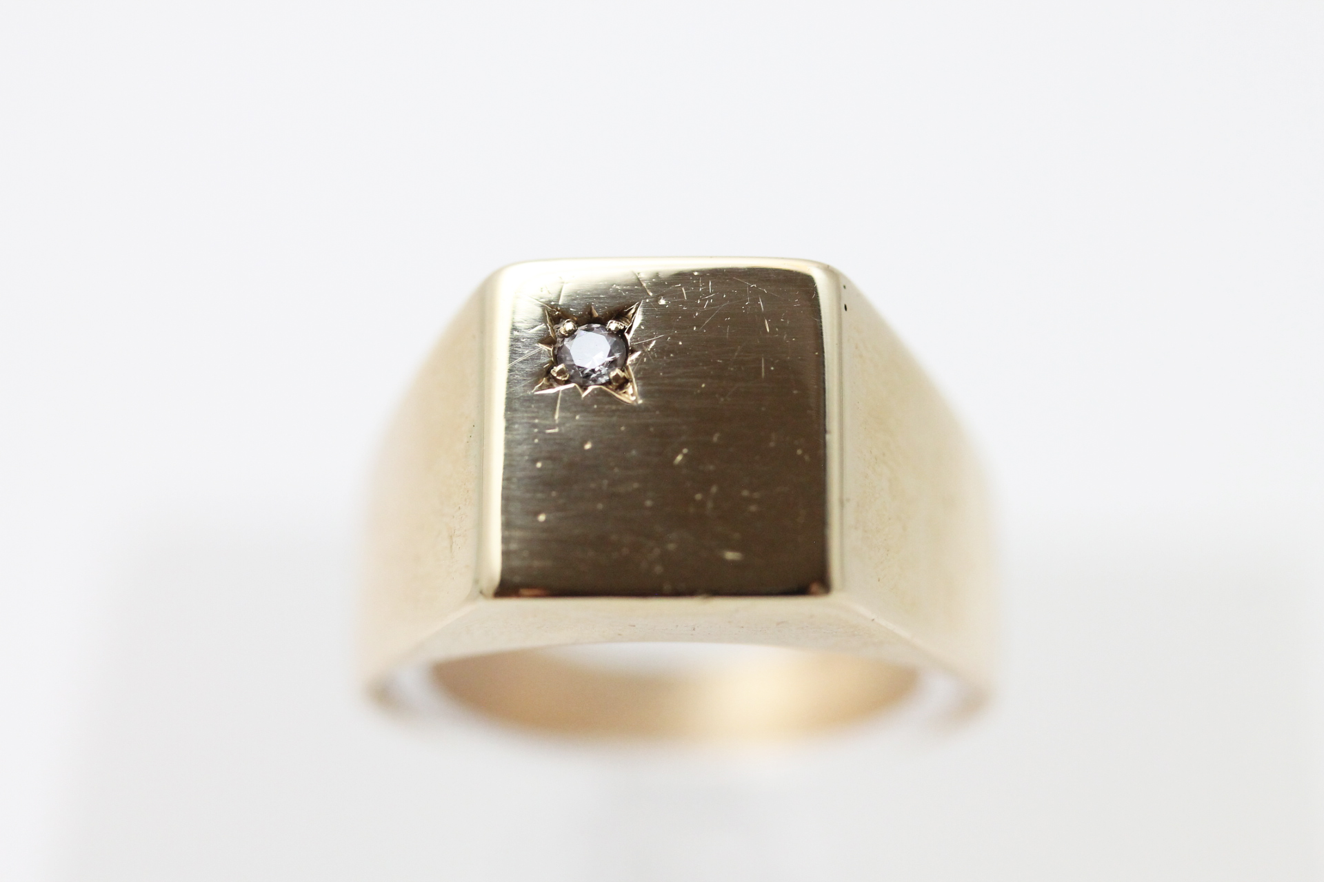 Ring i gult gull med diamant 14kt gult gull største breddemål 7,78 mm totalvekt 5,58 gram estimert diamantvekt 0.20ct estimert