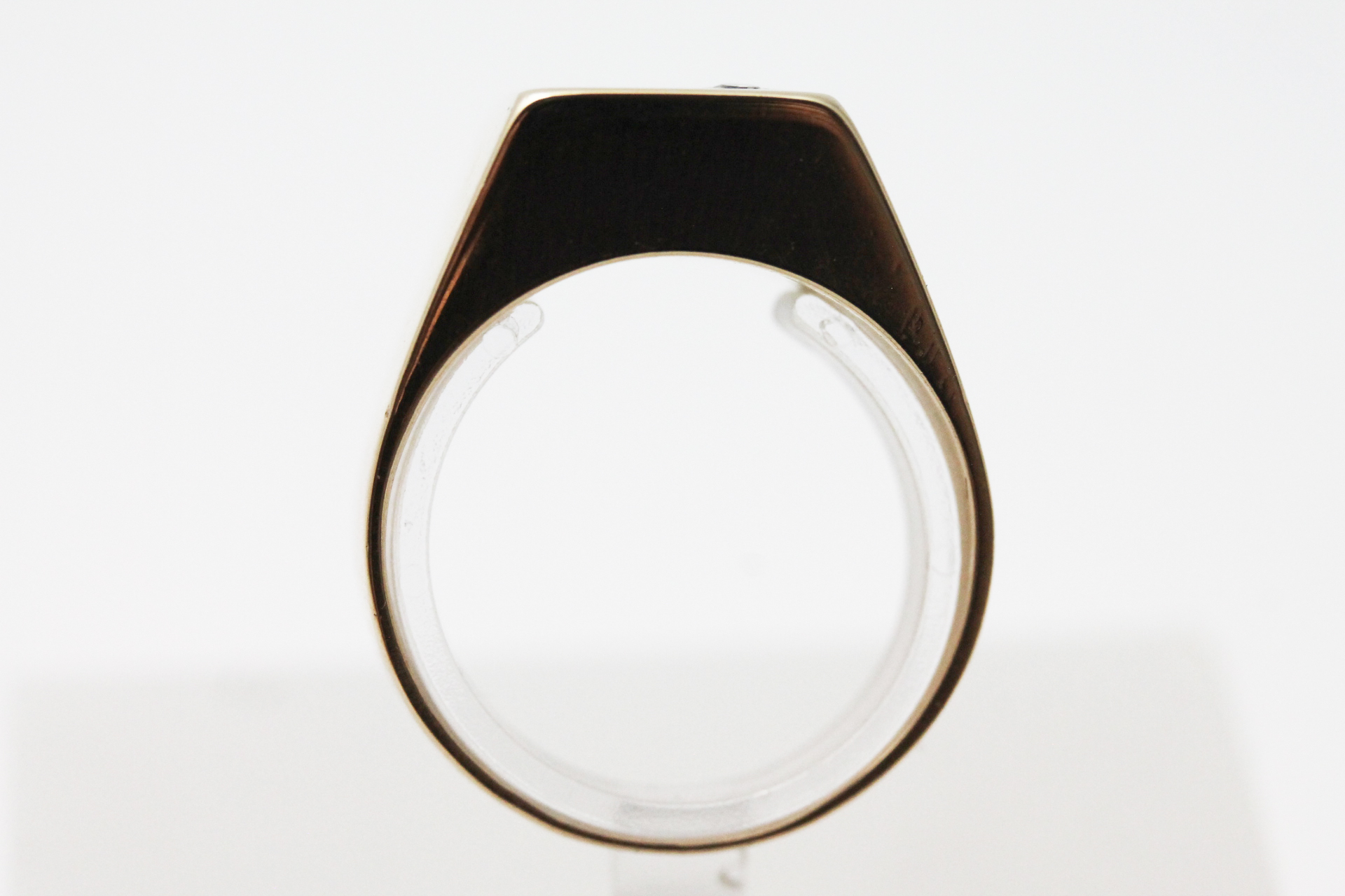Ring i gult gull med hematitt 14kt gult gull største breddemål 12,12 mm totalvekt 4,41 gram dimensjoner sten 10,41×9,02 mm