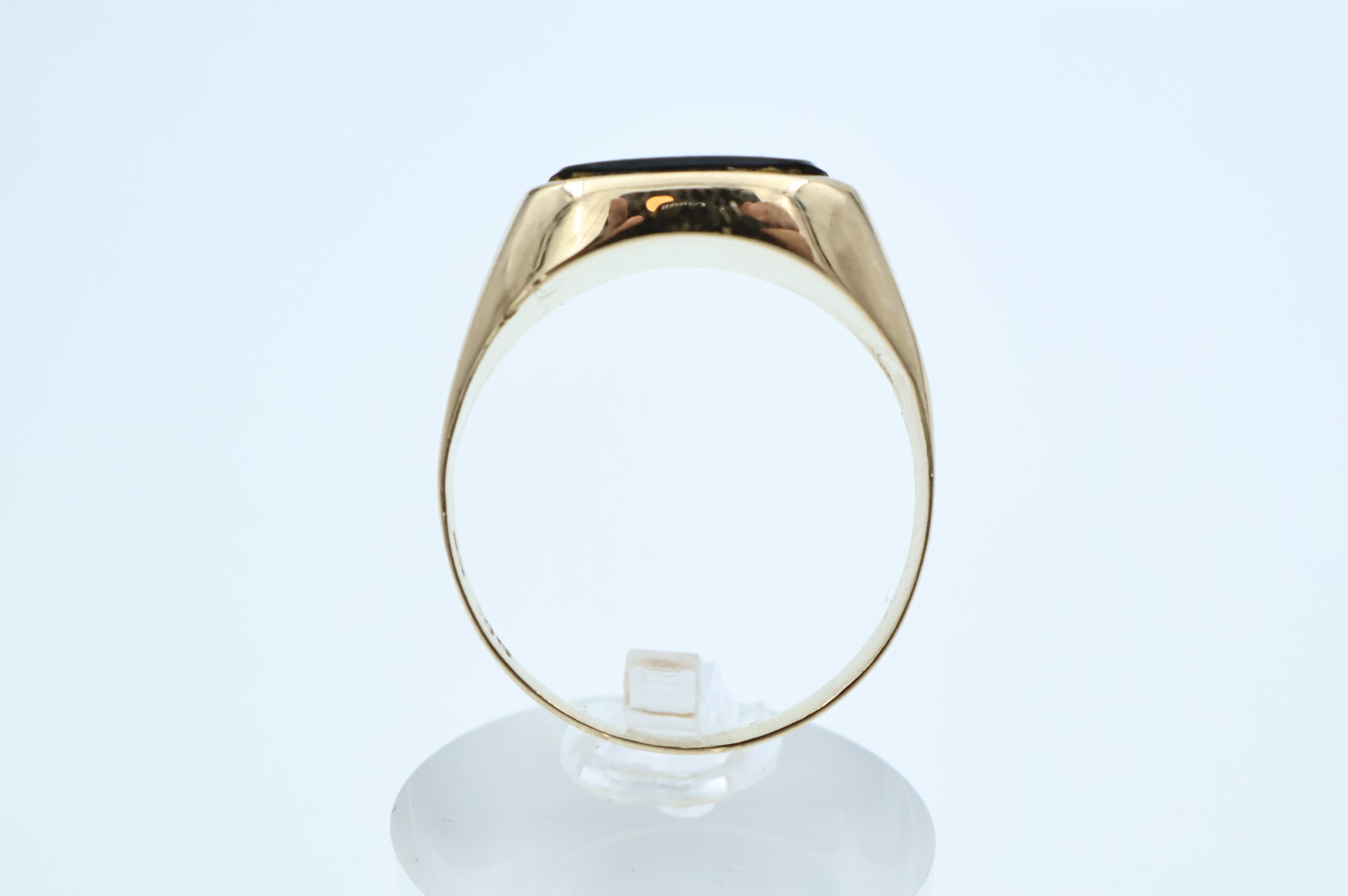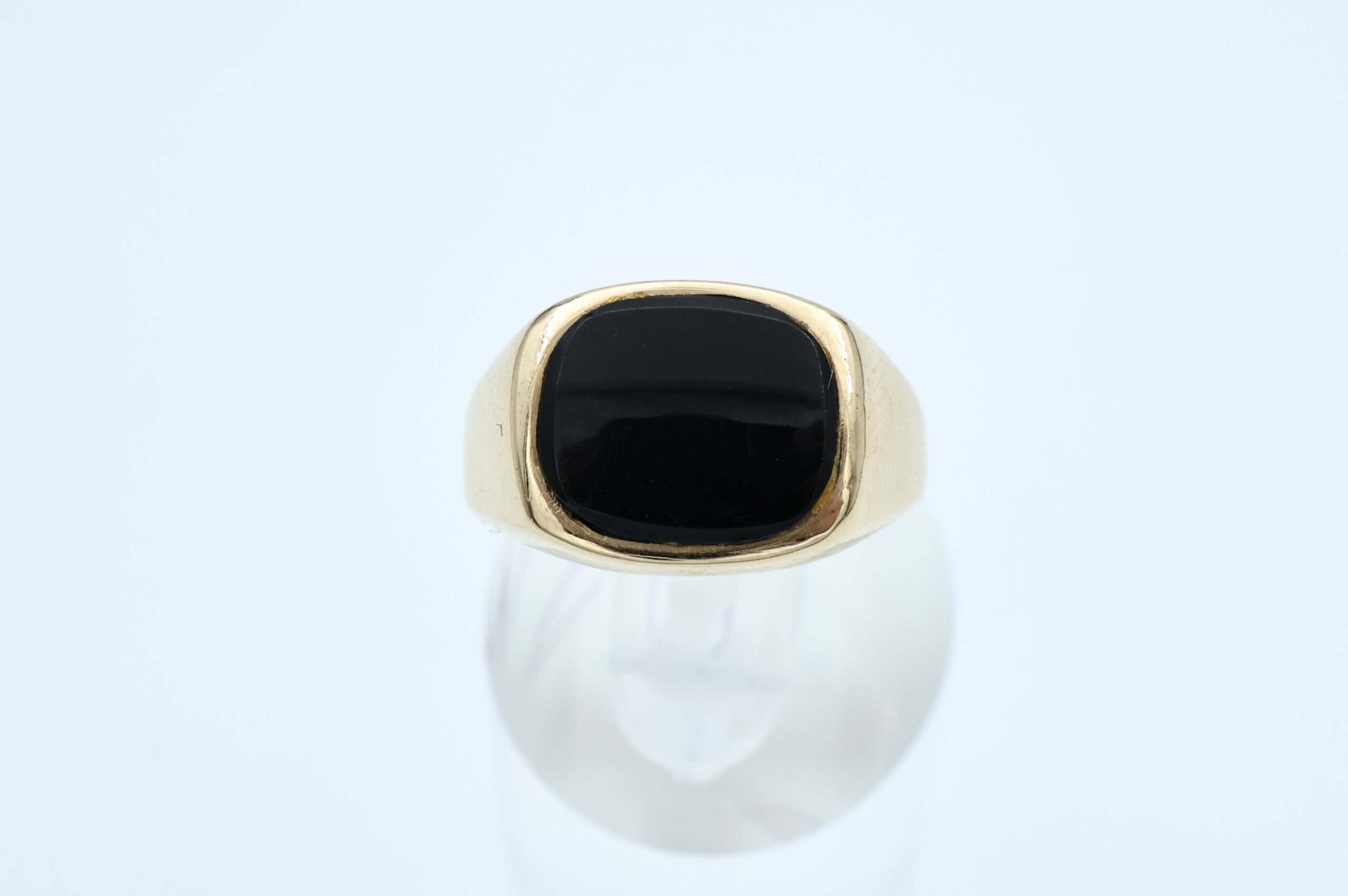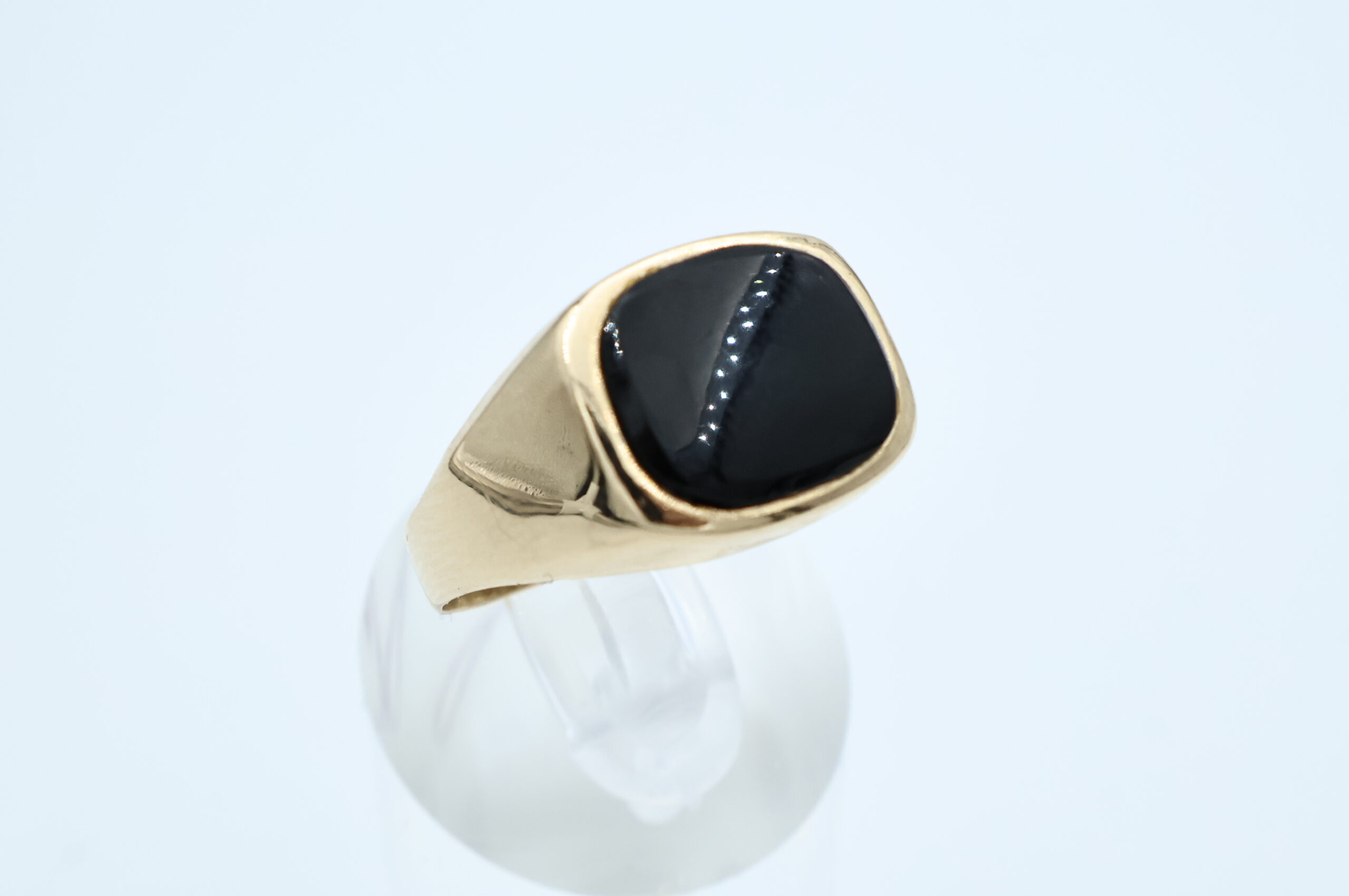 Ring i gult gull med hematitt 14kt gult gull største breddemål 12,12 mm totalvekt 4,41 gram dimensjoner sten 10,41×9,02 mm