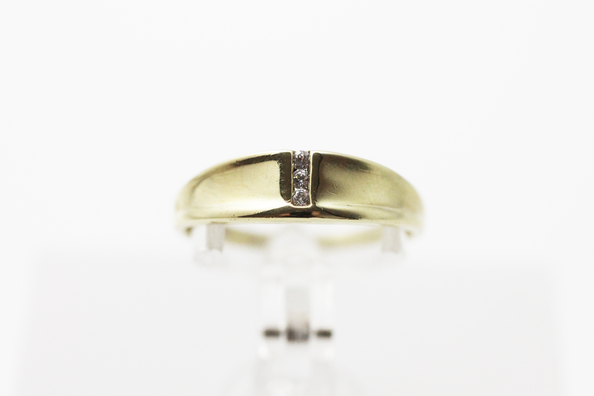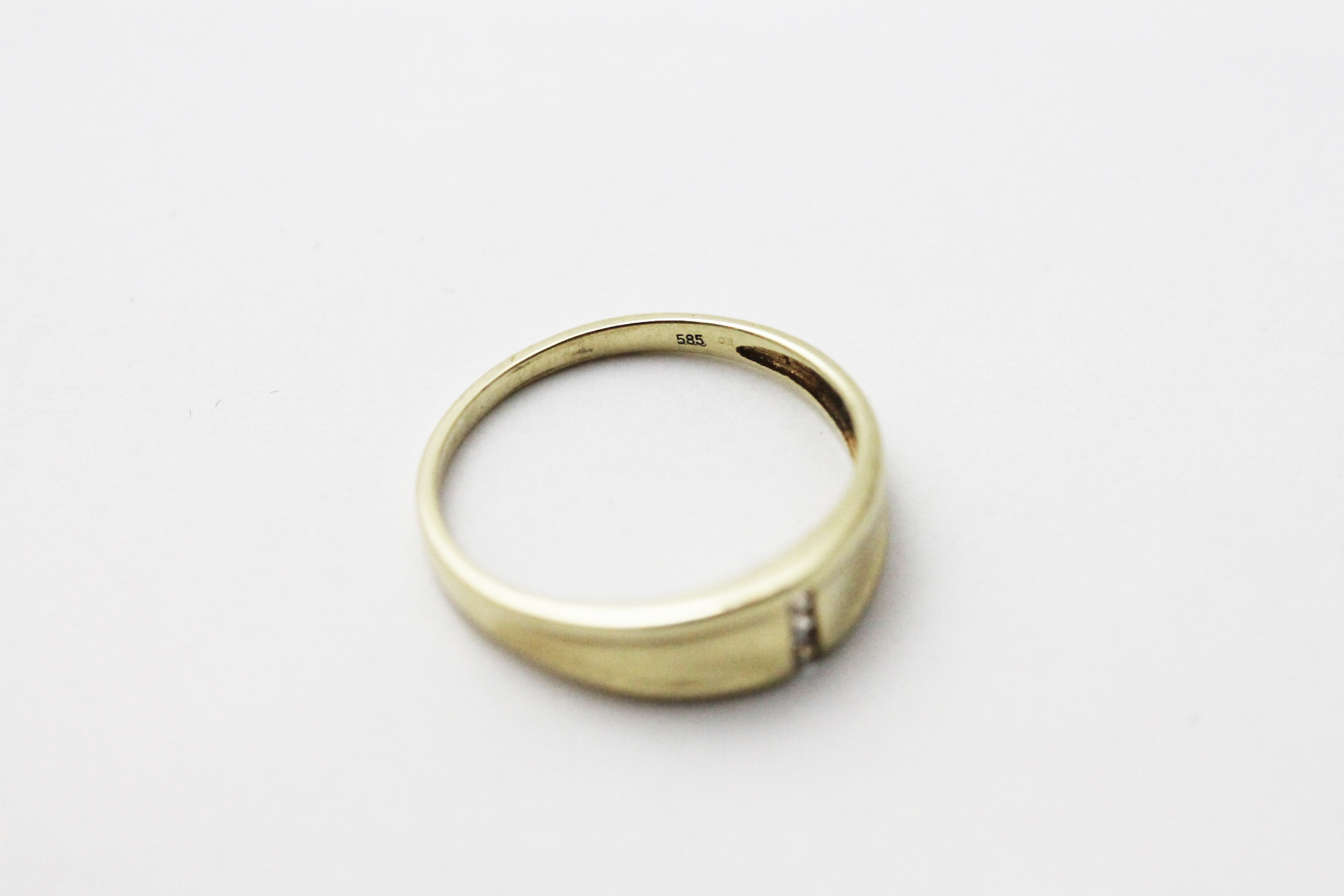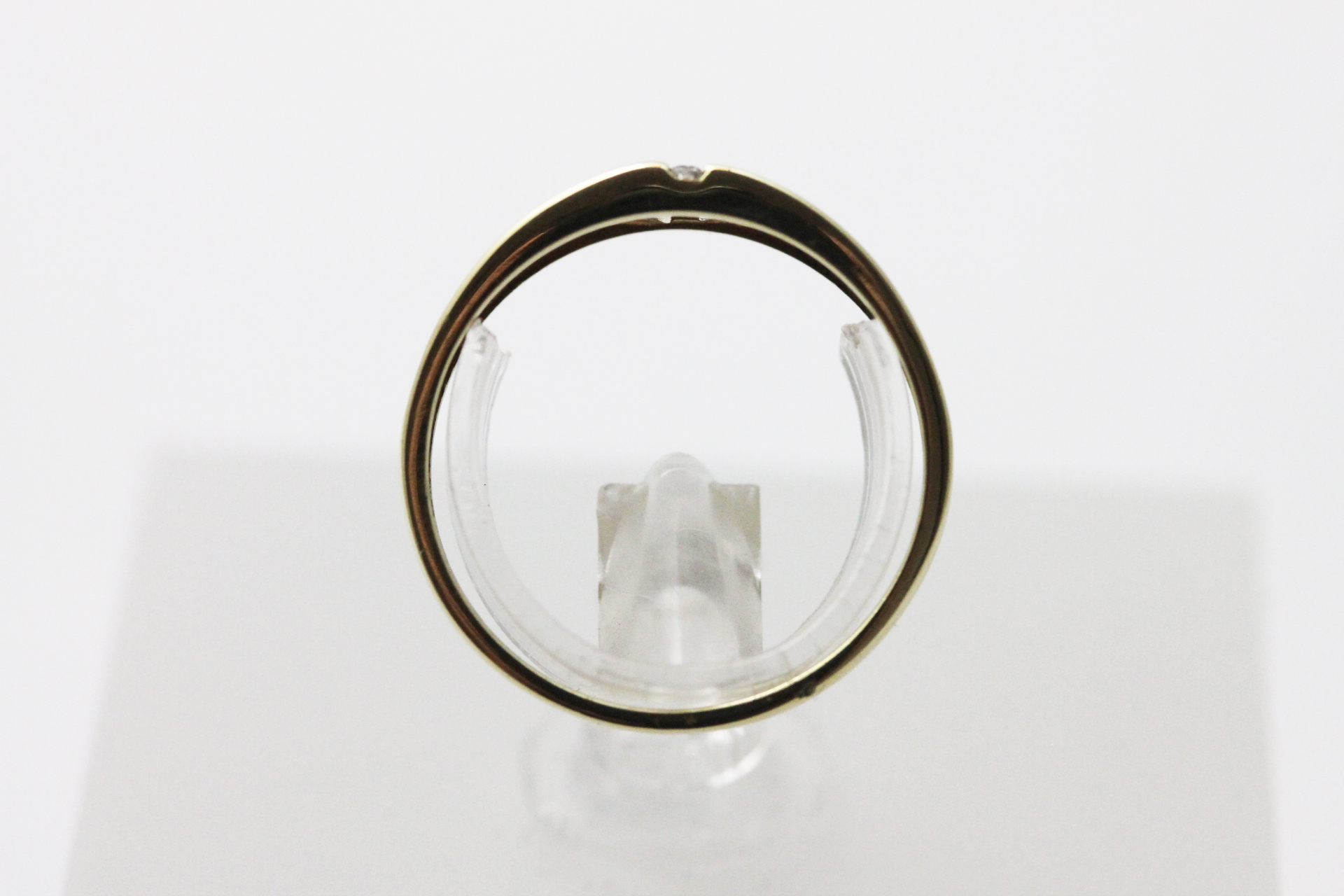 Ring i flerfarget gull med diamant 14kt gult, rødt og hvitt gull største breddemål 6,10 mm totalvekt 3,08 gram estimert