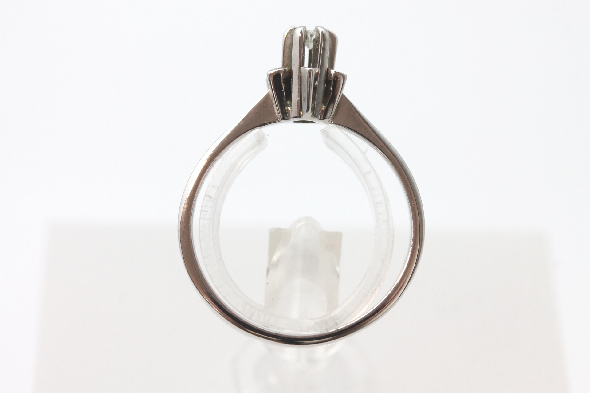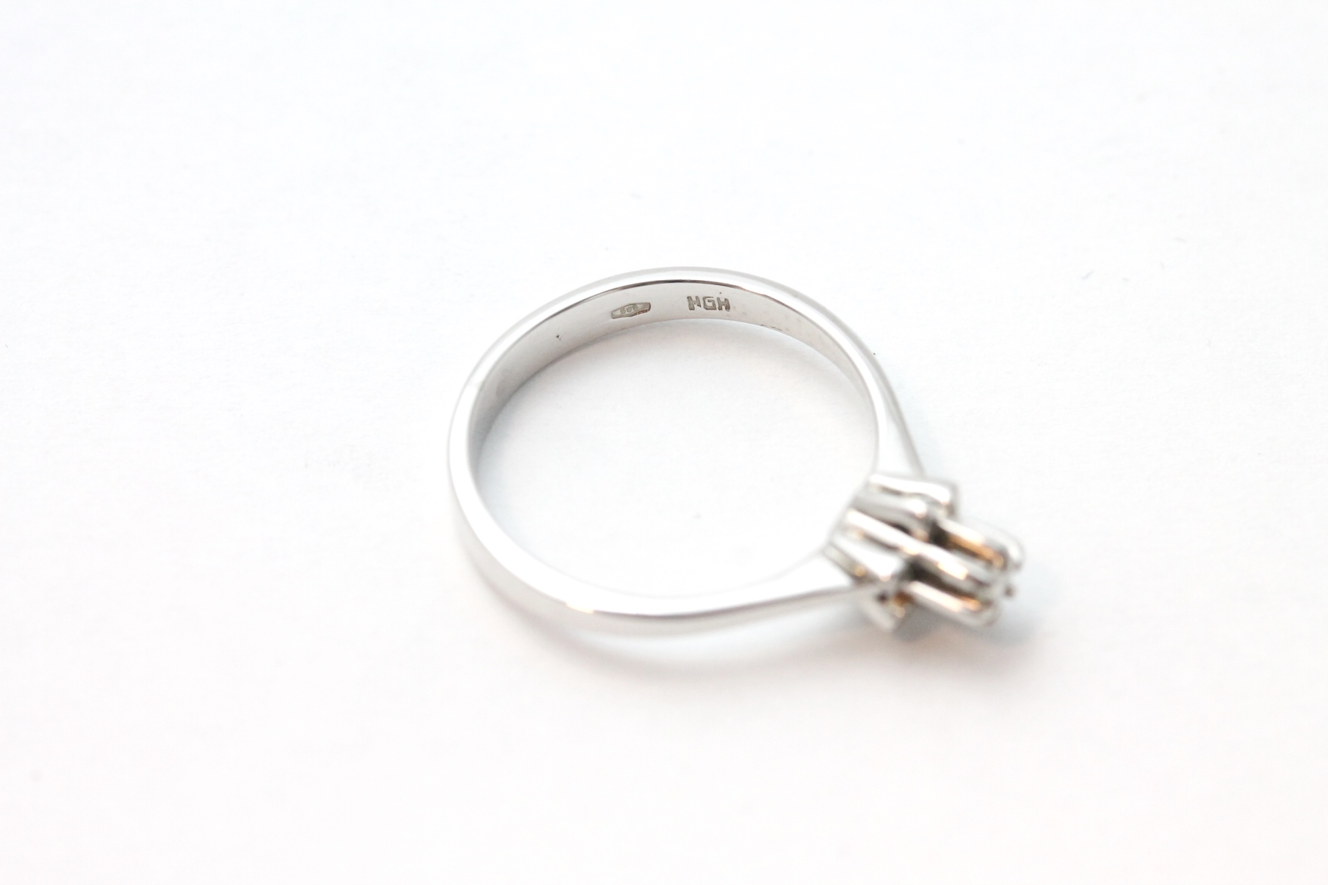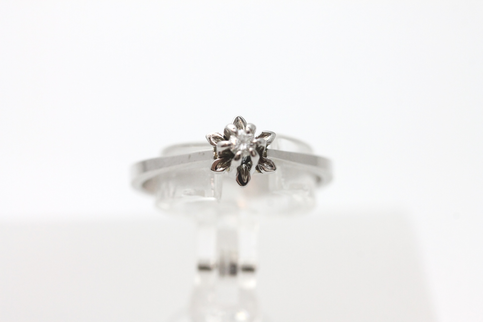 Ring i hvitt gull med diamant 14kt hvitt gull største breddemål 3,70 mm totalvekt 1,9 gram estimert diamantvekt 0.06ct estimert
