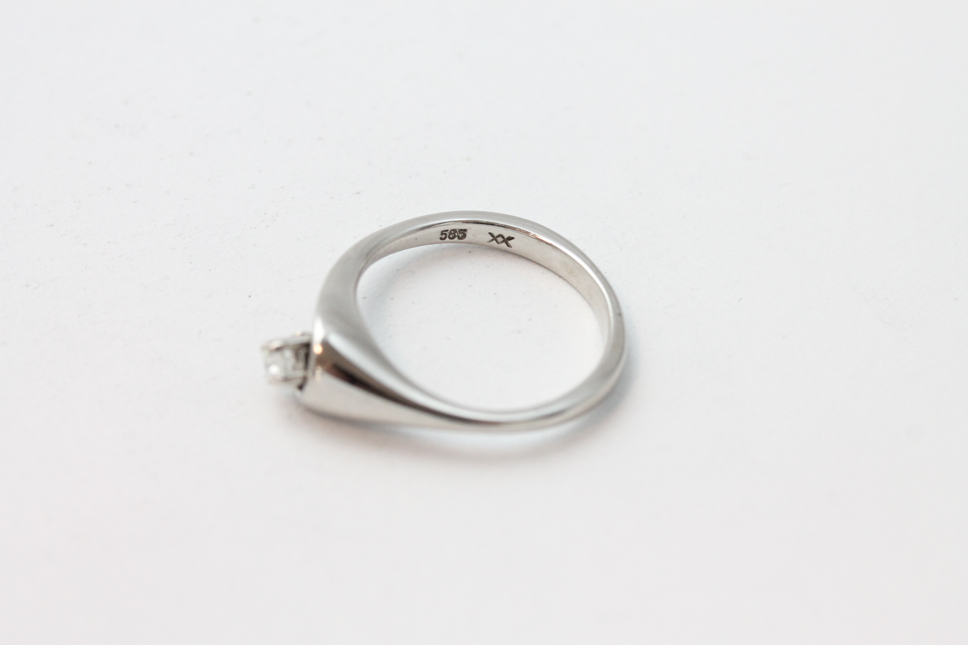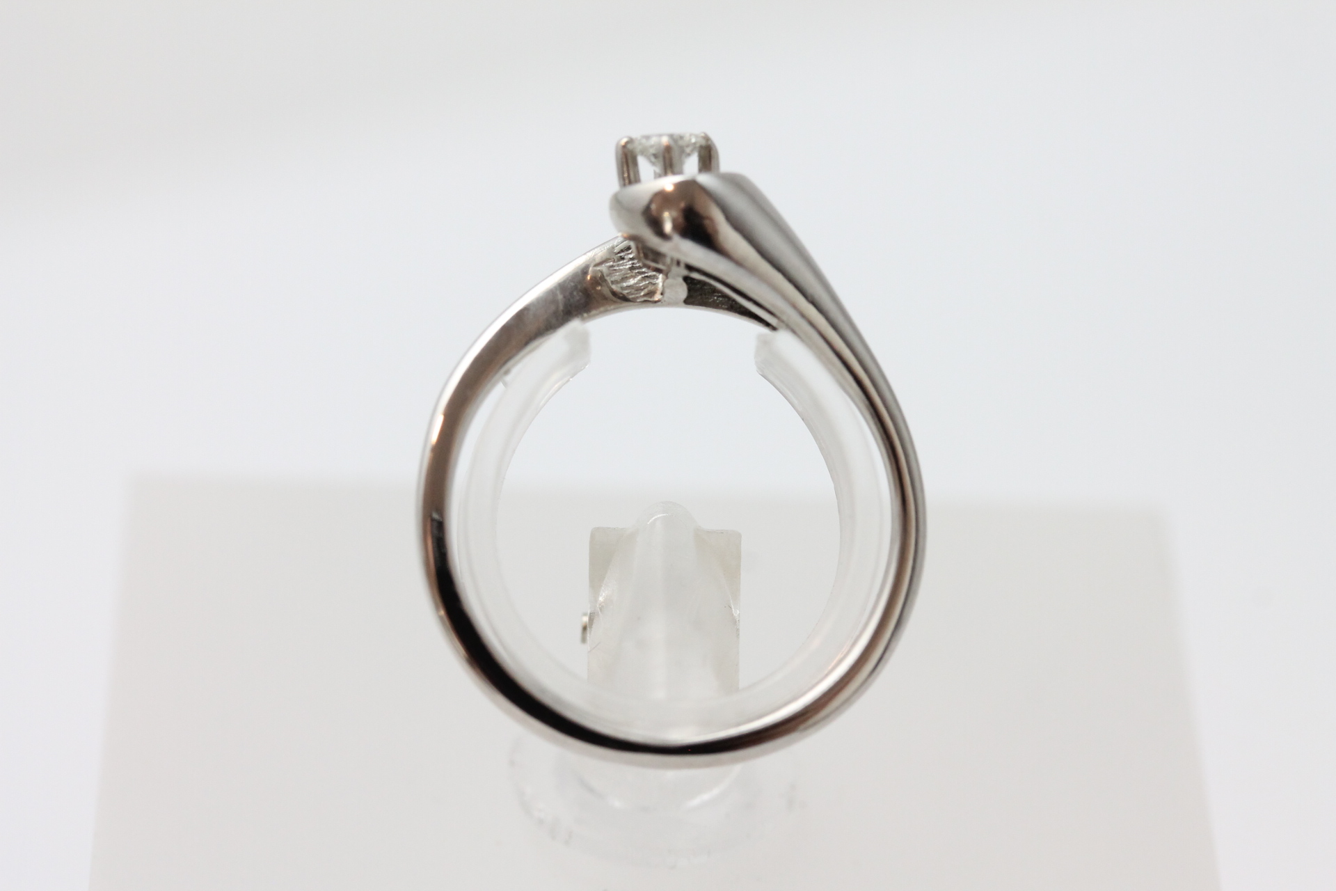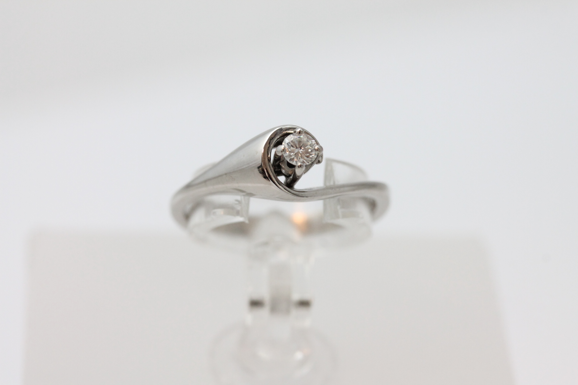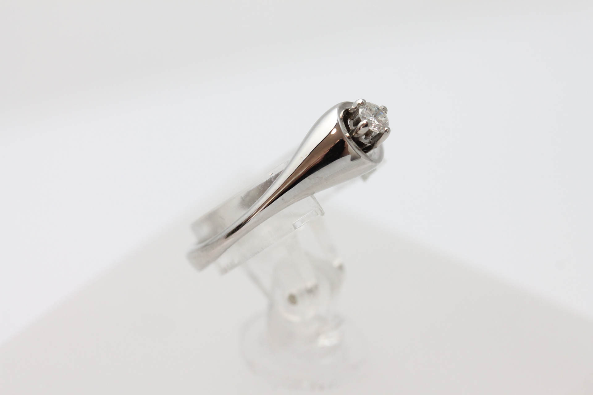 Ring i hvitt gull med diamant 14kt hvitt gull største breddemål 3,70 mm totalvekt 1,9 gram estimert diamantvekt 0.06ct estimert