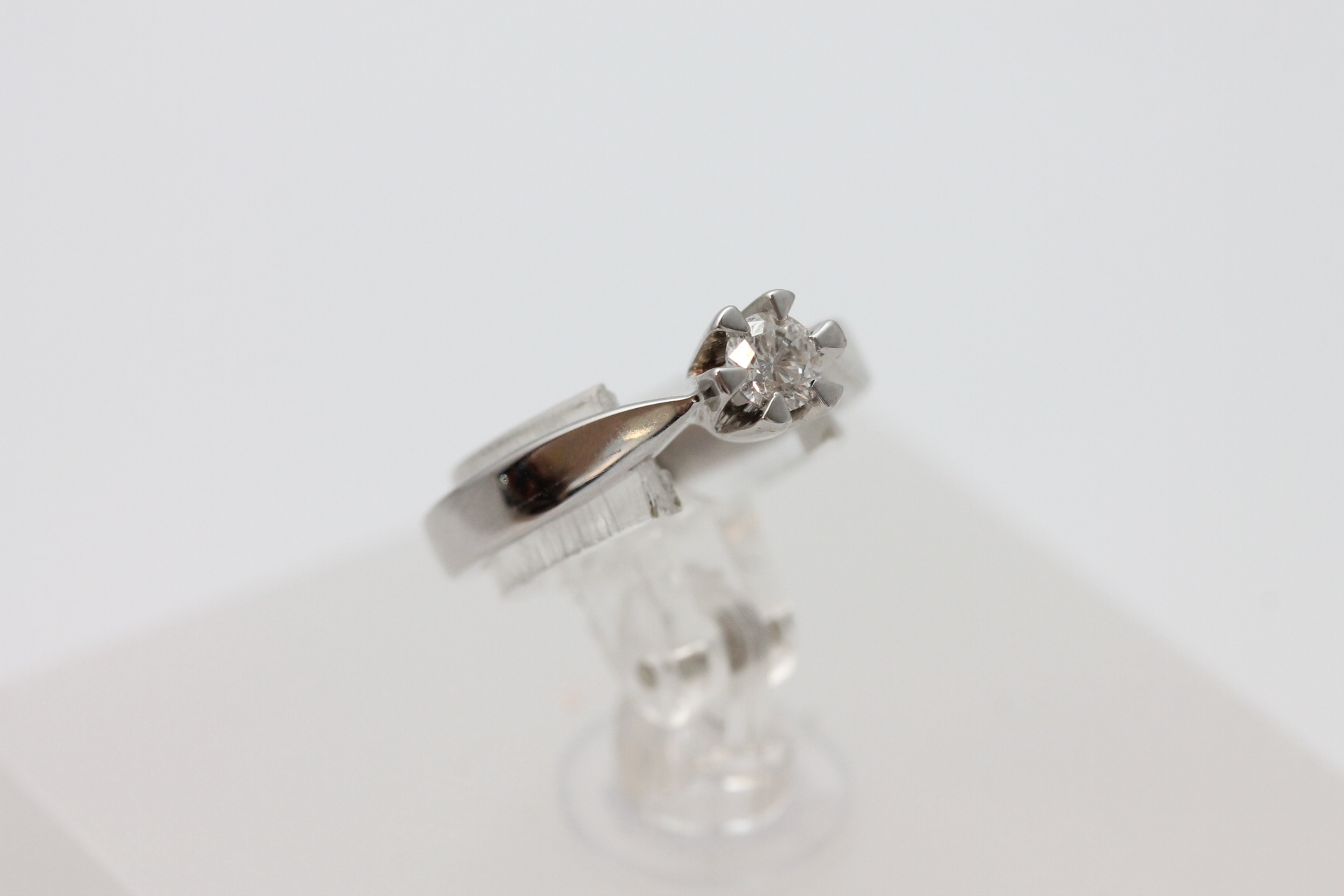 Ring i hvitt gull med diamant 14kt hvitt gull største breddemål 3,70 mm totalvekt 1,9 gram estimert diamantvekt 0.06ct estimert