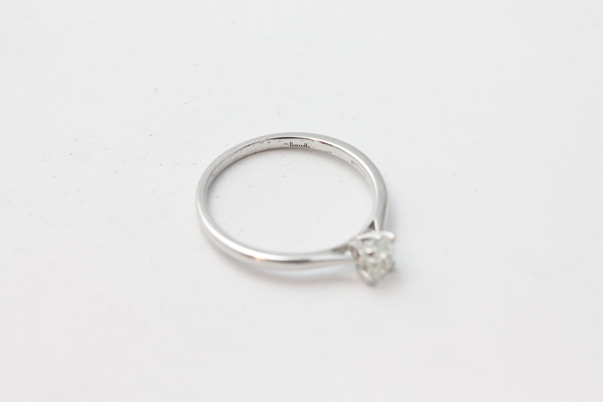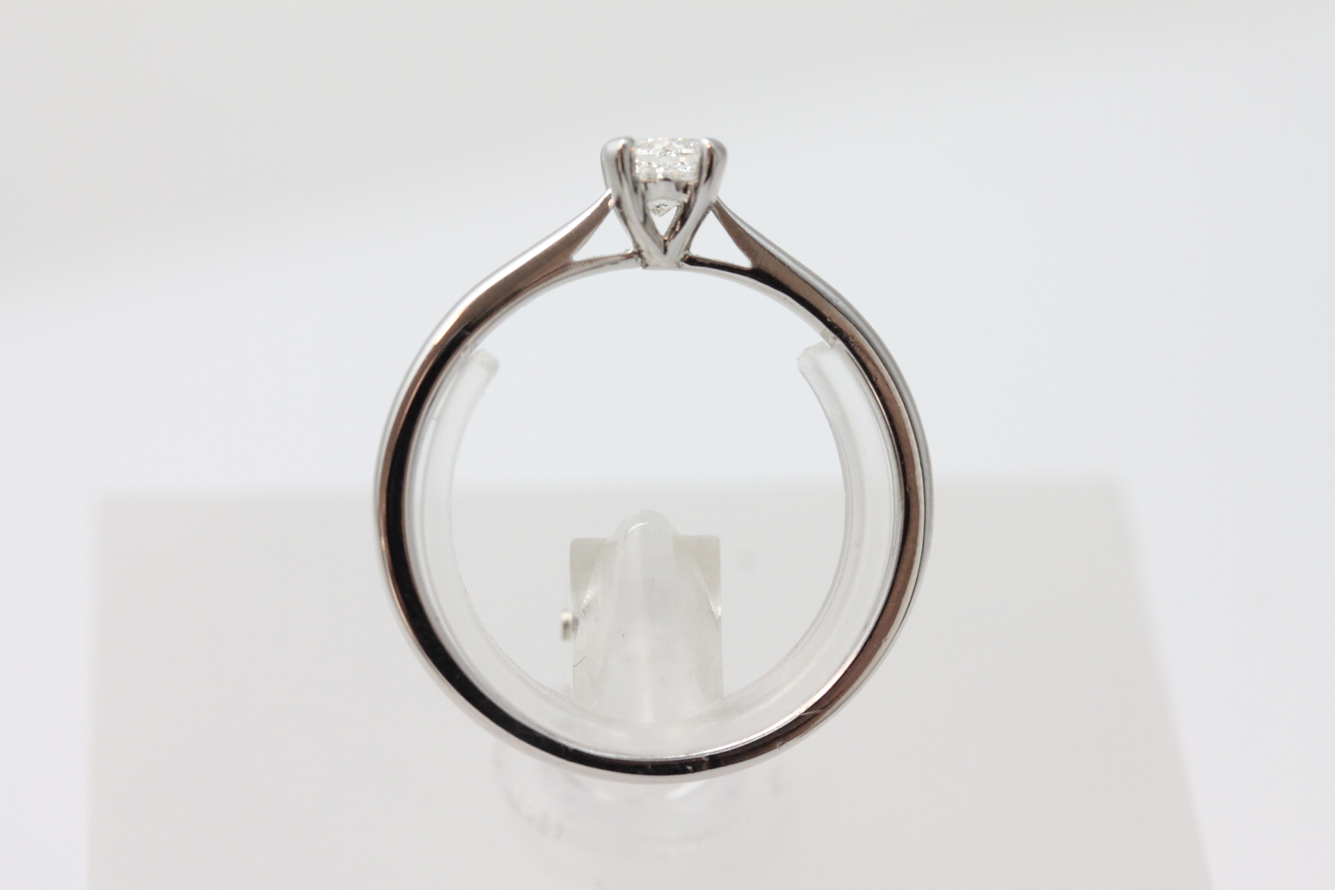 Ring i hvitt gull med diamant 14kt hvitt gull største breddemål 3,70 mm totalvekt 1,9 gram estimert diamantvekt 0.06ct estimert