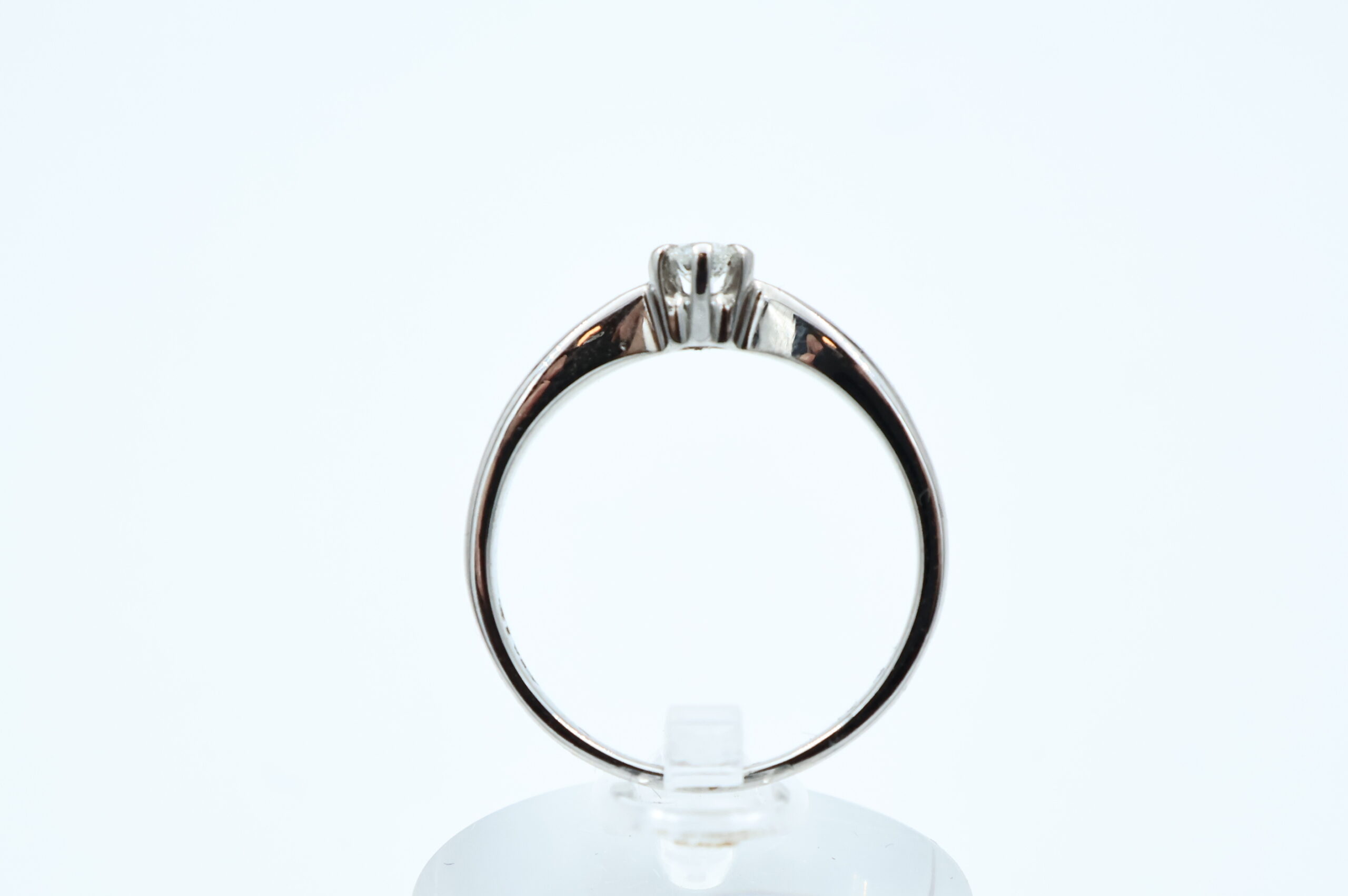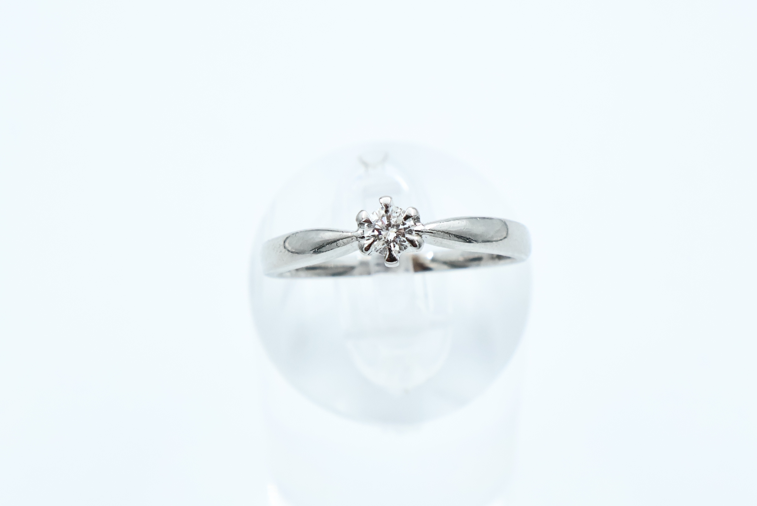 Ring i hvitt gull med diamant 14kt hvitt gull største breddemål 3,70 mm totalvekt 1,9 gram estimert diamantvekt 0.06ct estimert