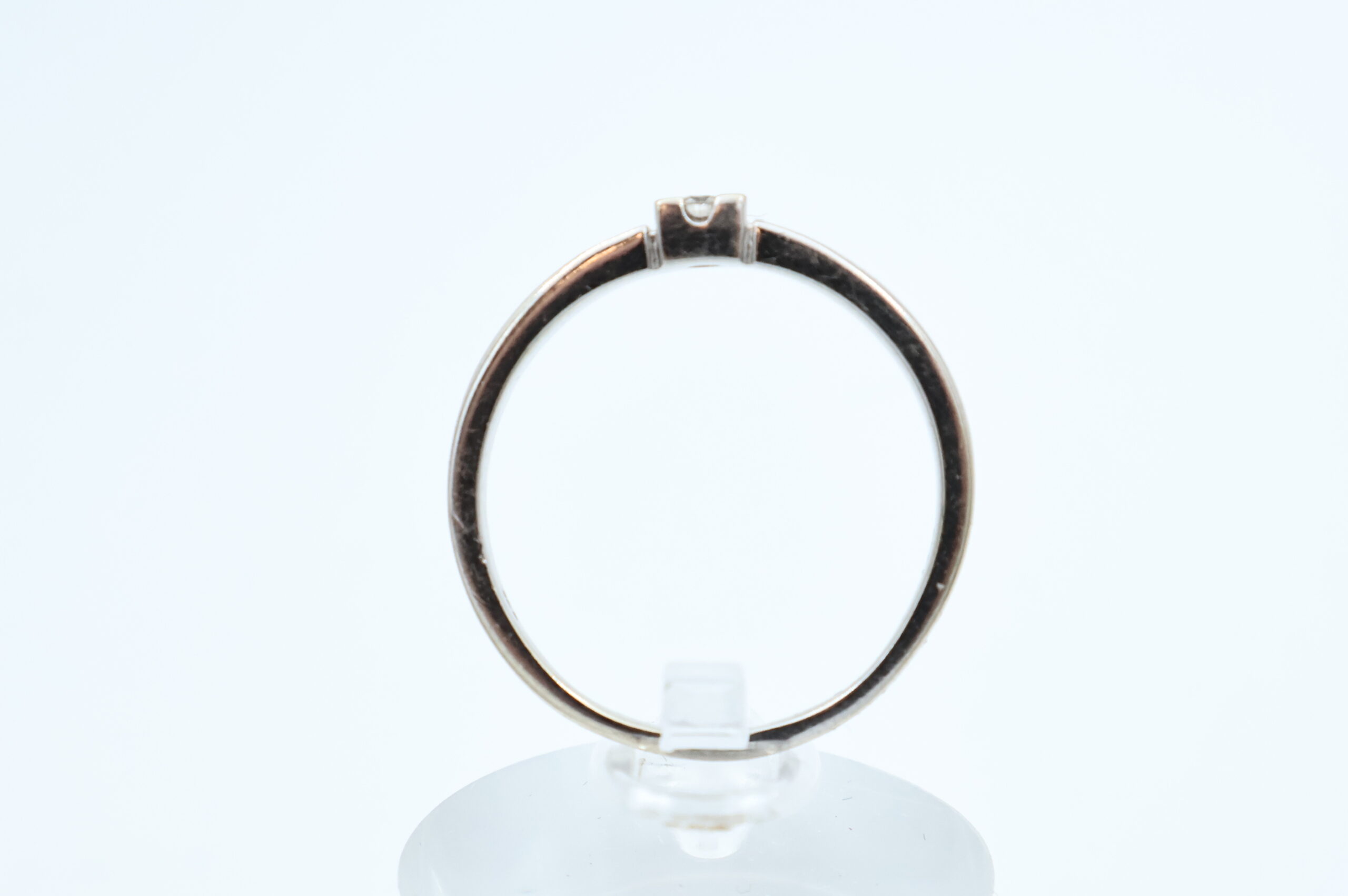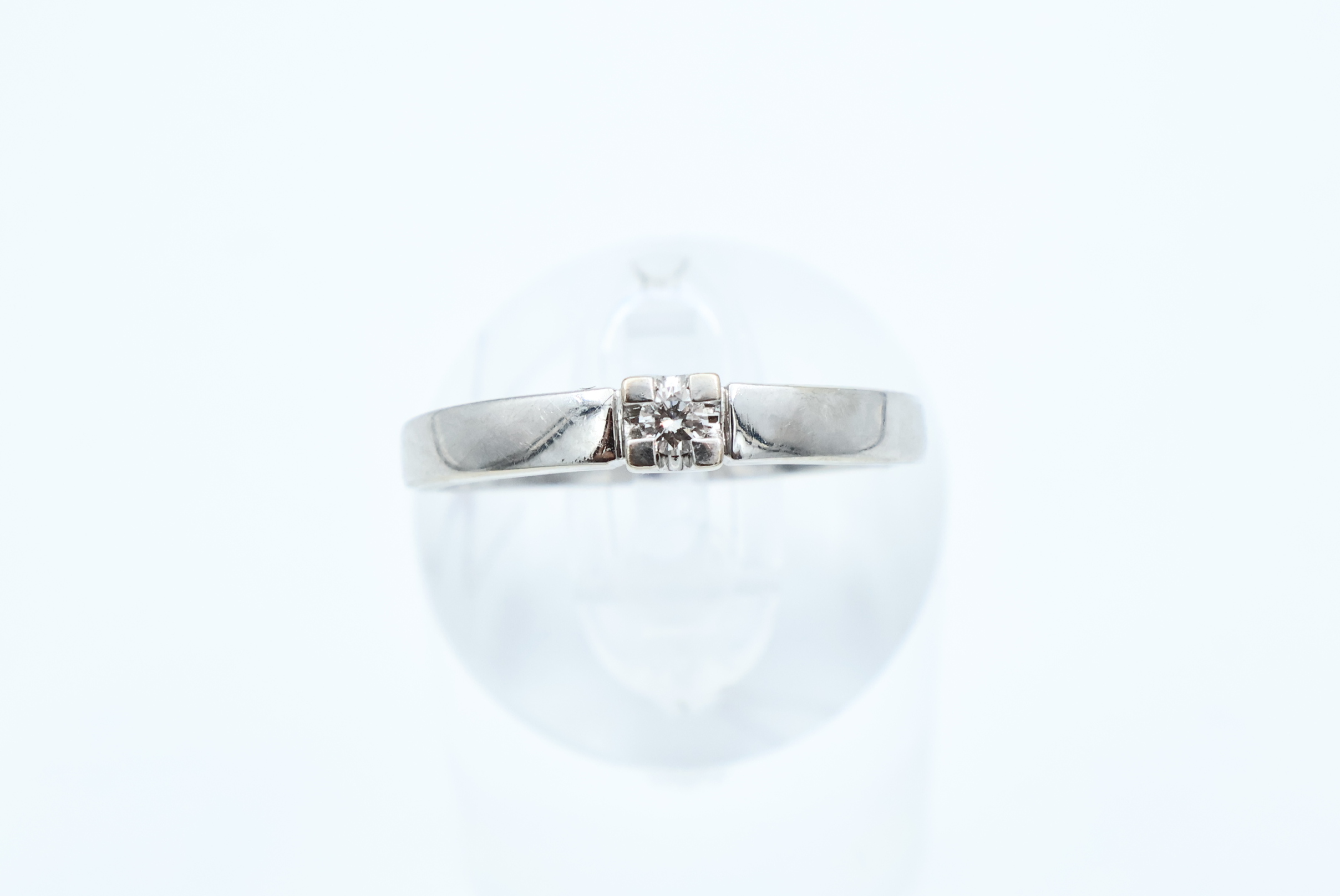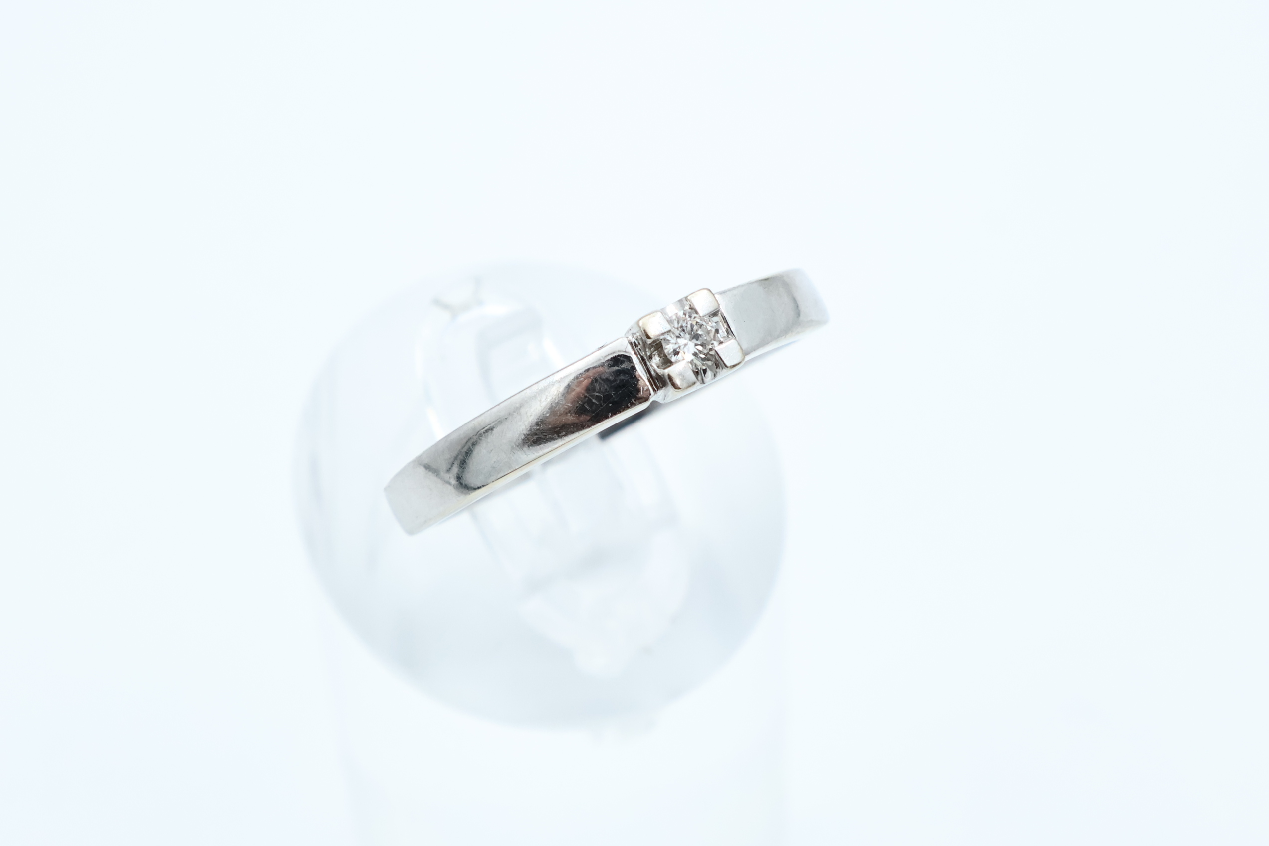 Ring i hvitt gull med diamant 14kt hvitt gull største breddemål 5,1 mm totalvekt 2,07 gram estimert diamantvekt 0.16ct estimert