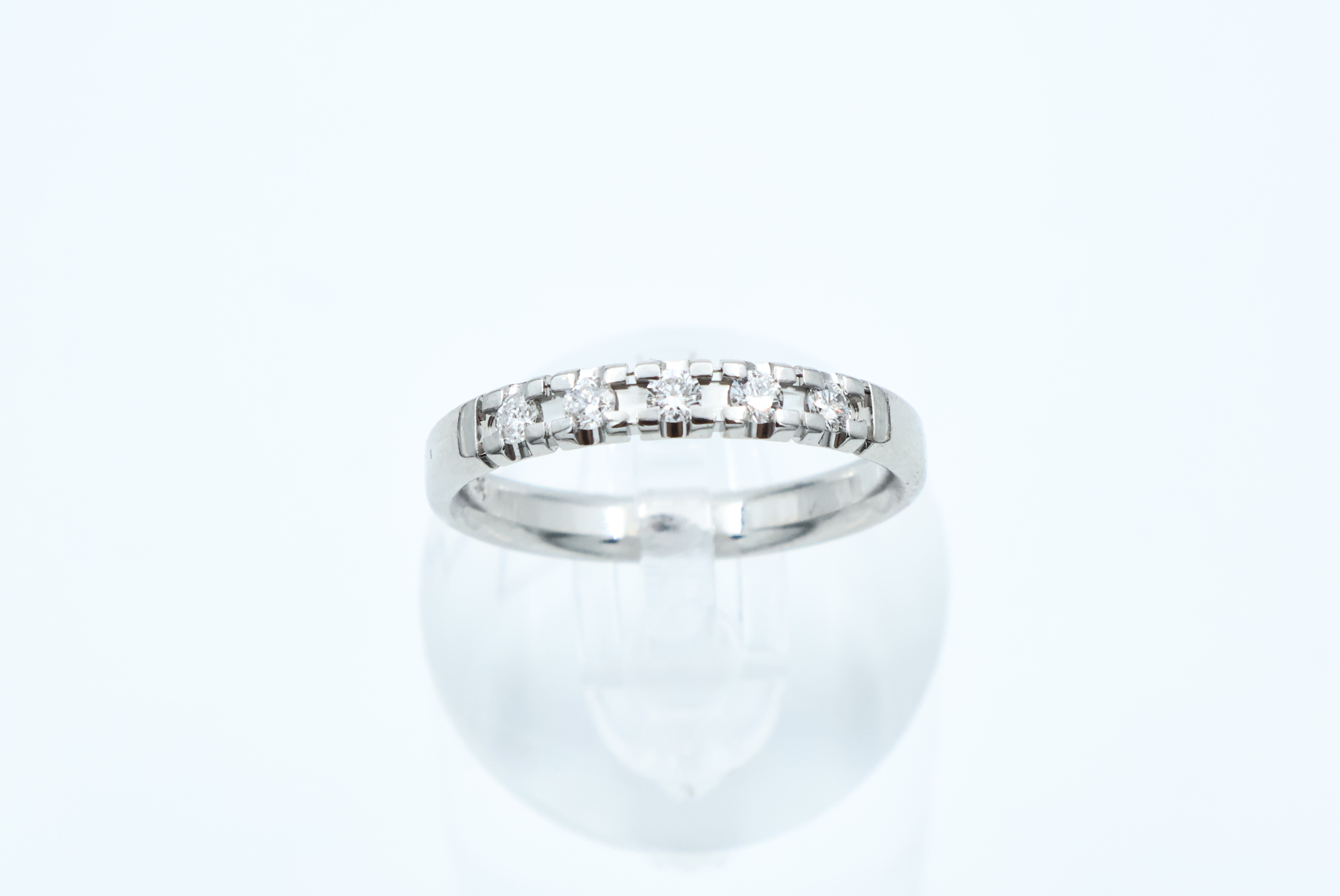 Ring i hvitt gull med diamant 14kt hvitt gull største breddemål 3,9 mm totalvekt 2,20 gram diamantvekt 0.17ct farge og