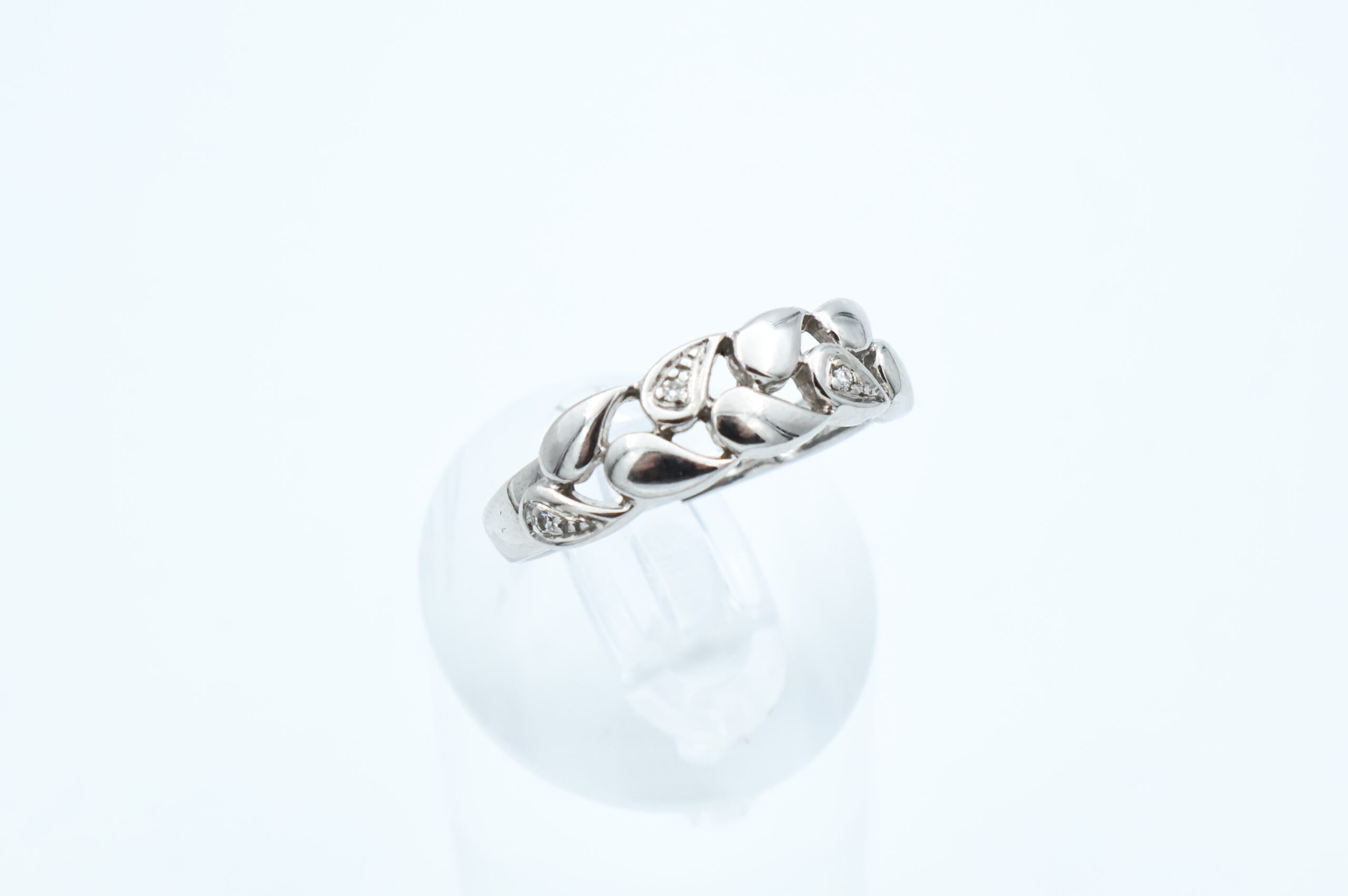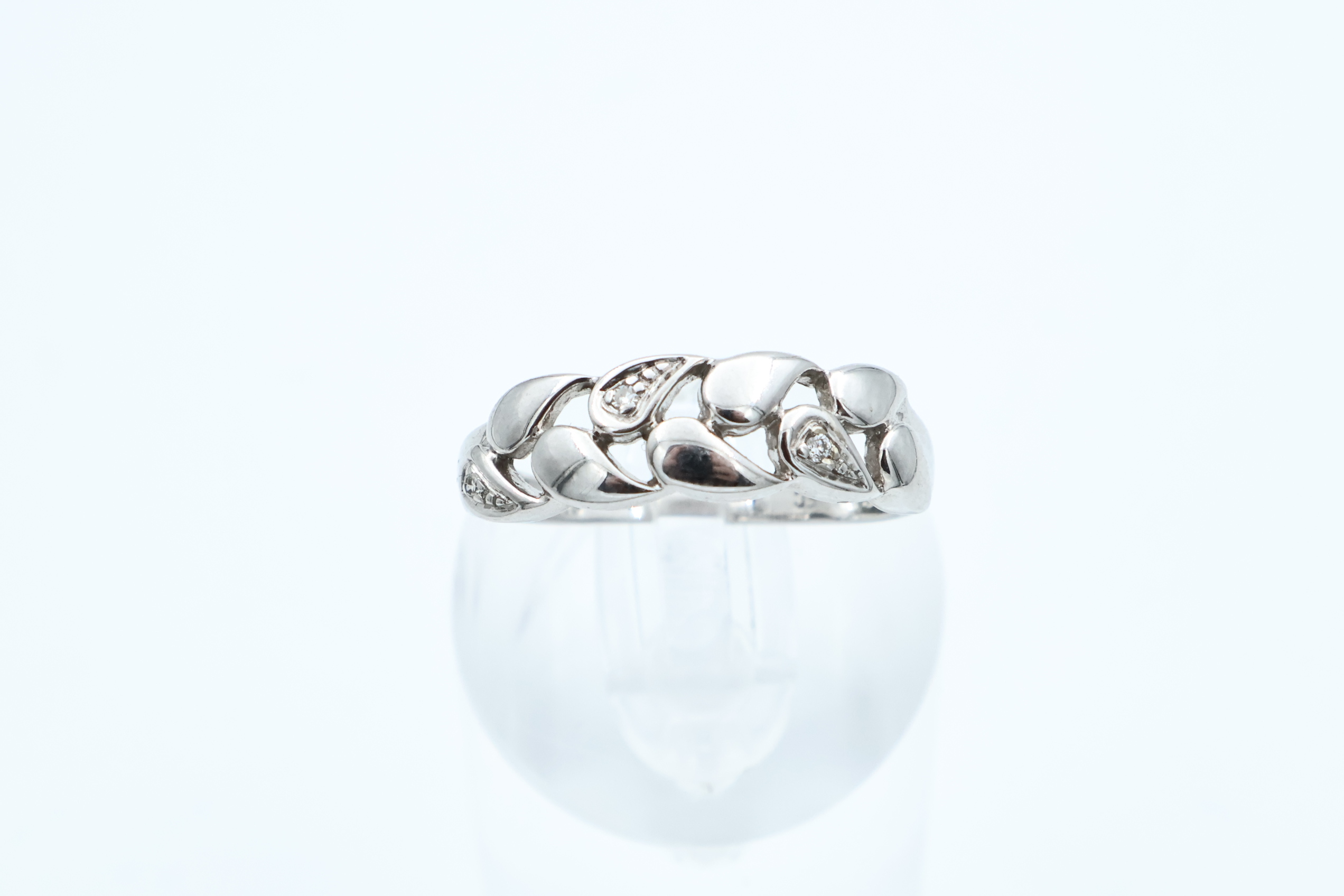 Ring i hvitt gull med diamanter 14kt hvitt gull største breddemål 11,93 mm totalvekt 3,94 gram estimert diamantvekt 0,06ct fordelt