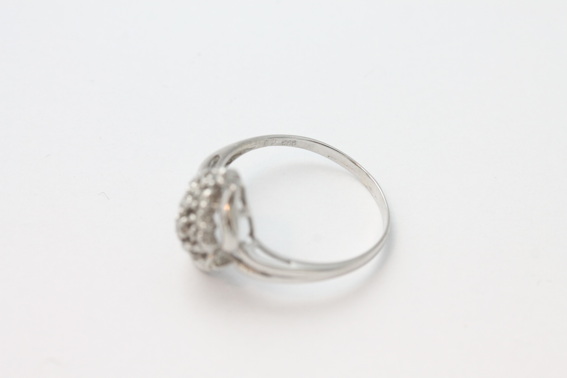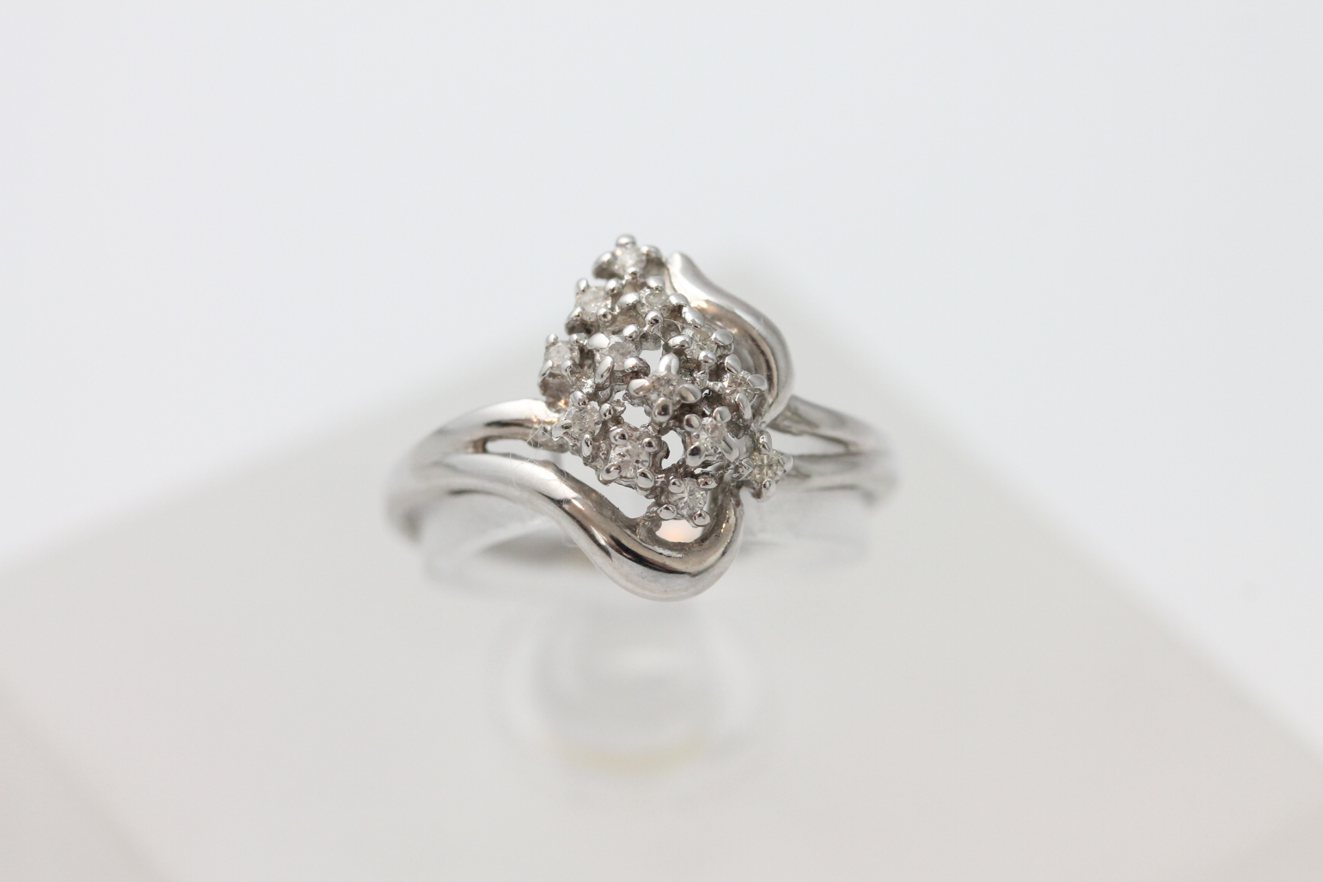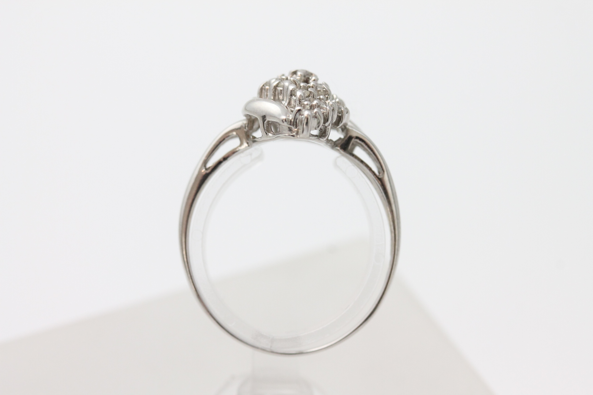 Ring i hvitt gull med diamanter 14kt hvitt gull, syretestet største breddemål 7,0 mm totalvekt 2,7 gram estimert 0.27ct fordelt