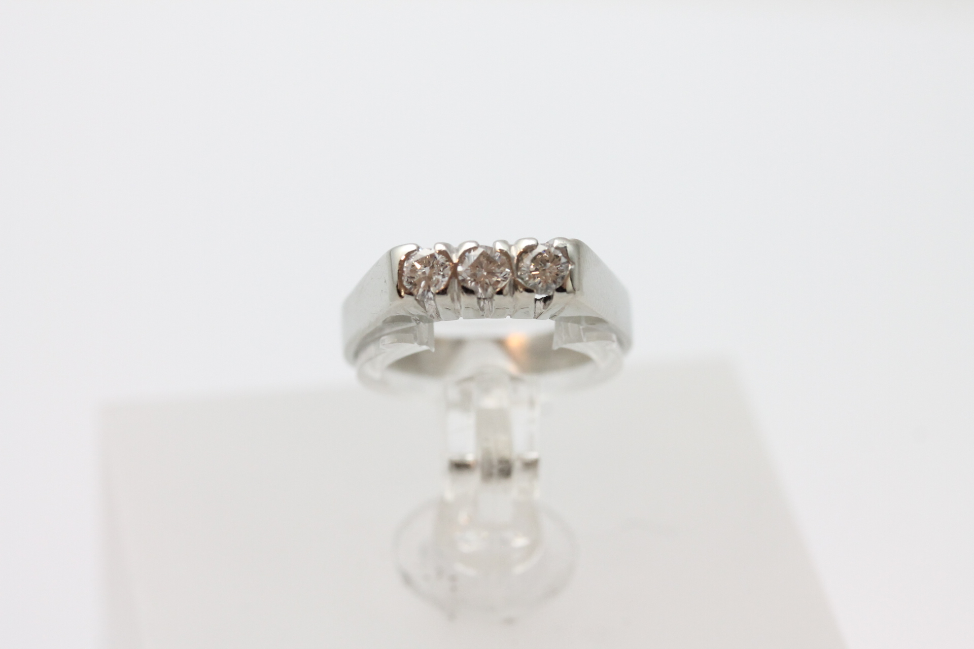 Ring i hvitt gull med diamanter 14kt hvitt gull, syretestet største breddemål 7,0 mm totalvekt 2,7 gram estimert 0.27ct fordelt