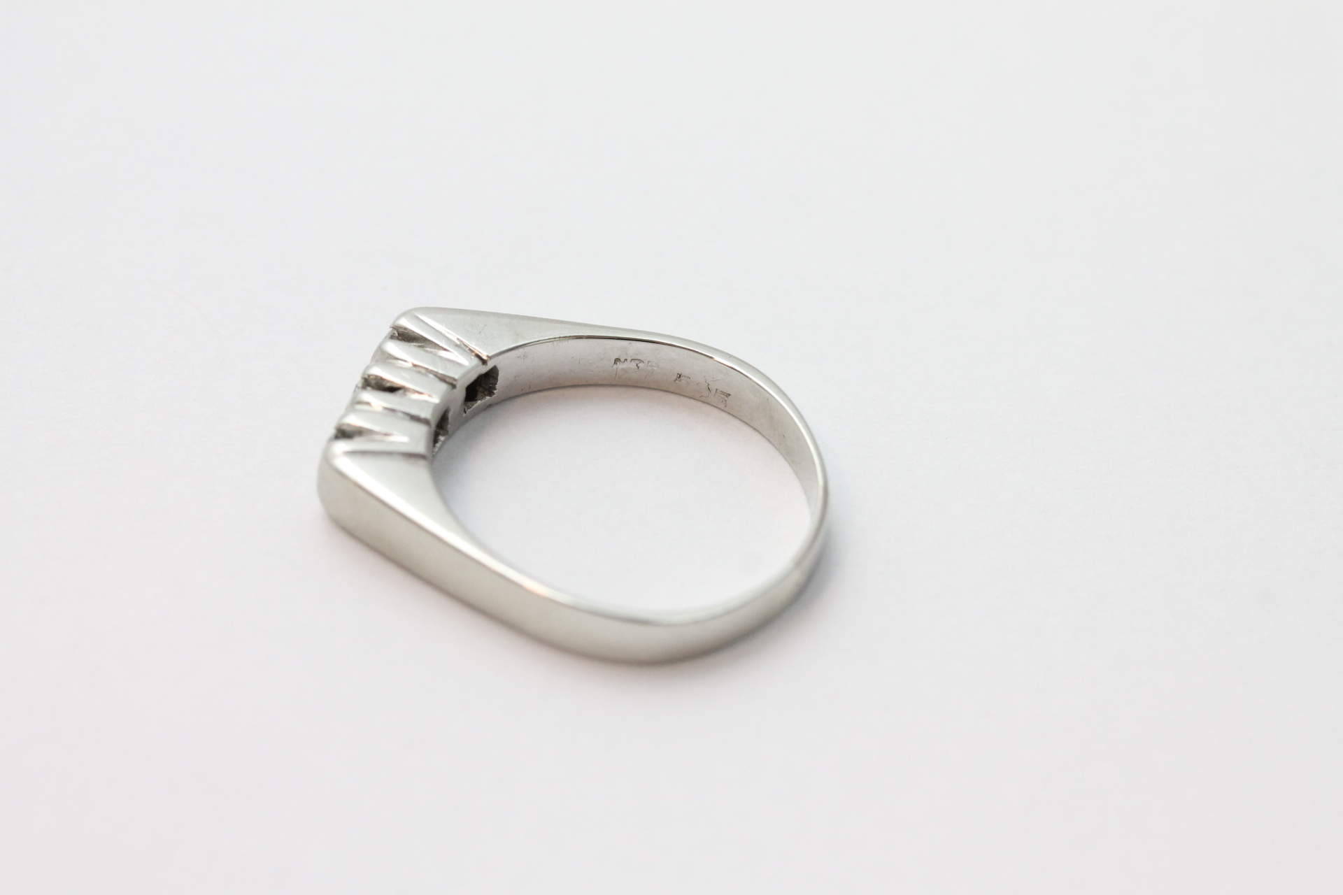 Ring i hvitt gull med diamant 14kt hvitt gull største breddemål 5,1 mm totalvekt 2,07 gram estimert diamantvekt 0.16ct estimert
