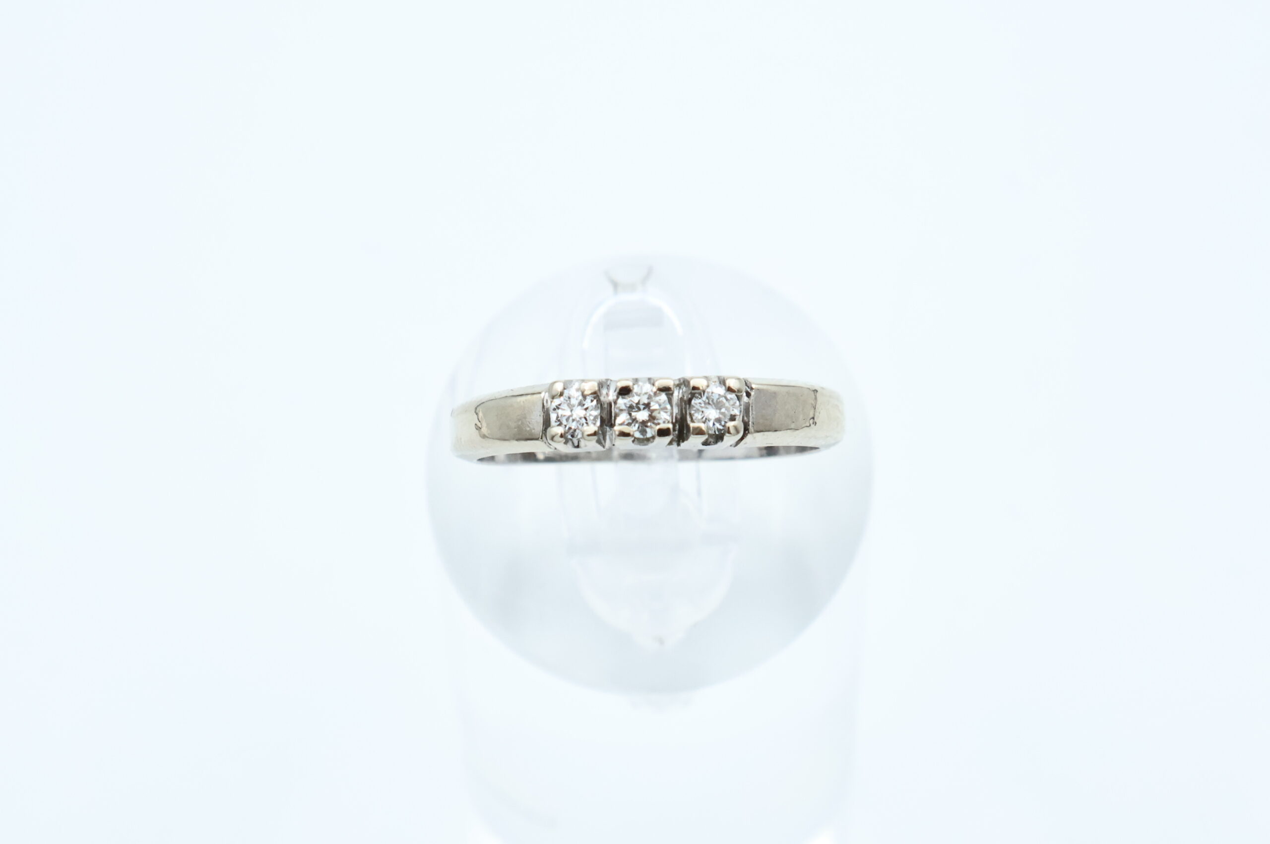 Ring i hvitt gull med diamanter 14kt hvitt gull, syretestet største breddemål 7,0 mm totalvekt 2,7 gram estimert 0.27ct fordelt