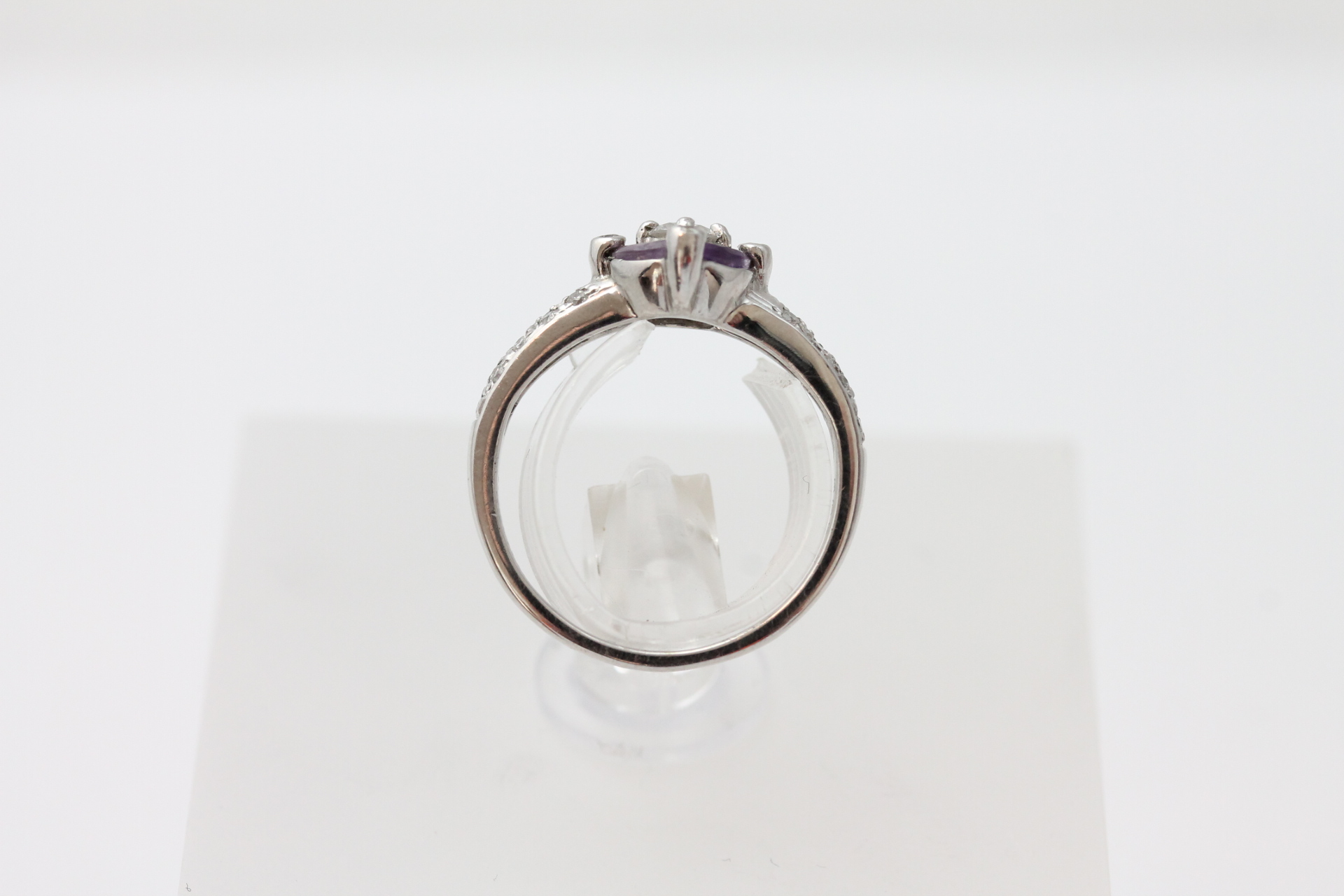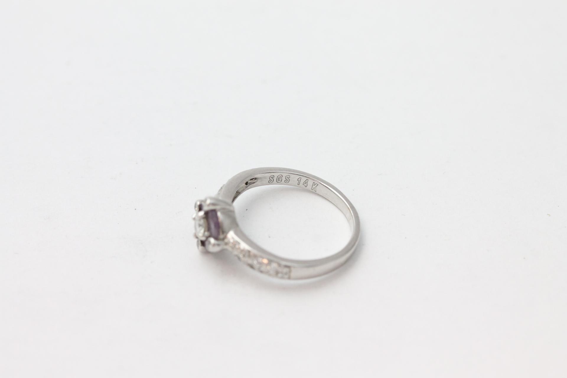 Ring i hvitt gull med diamant 14kt hvitt gull største breddemål 5,1 mm totalvekt 2,07 gram estimert diamantvekt 0.16ct estimert