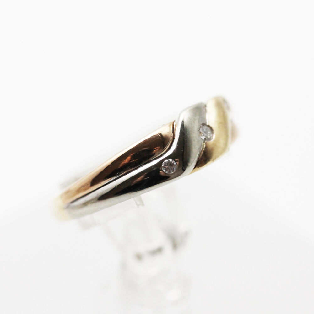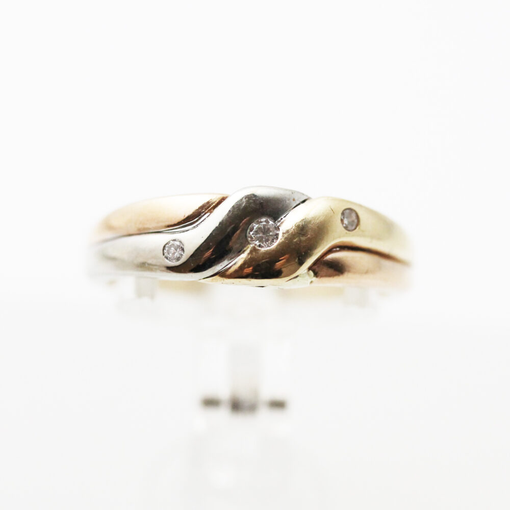 Ring i flerfarget gull med diamant 14kt gult, rødt og hvitt gull største breddemål 6,10 mm totalvekt 3,08 gram estimert